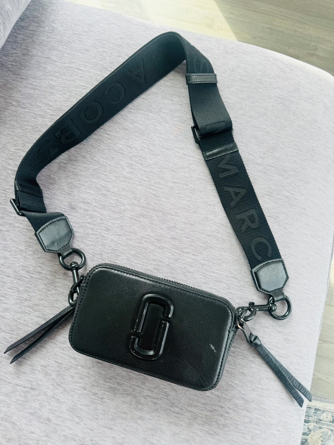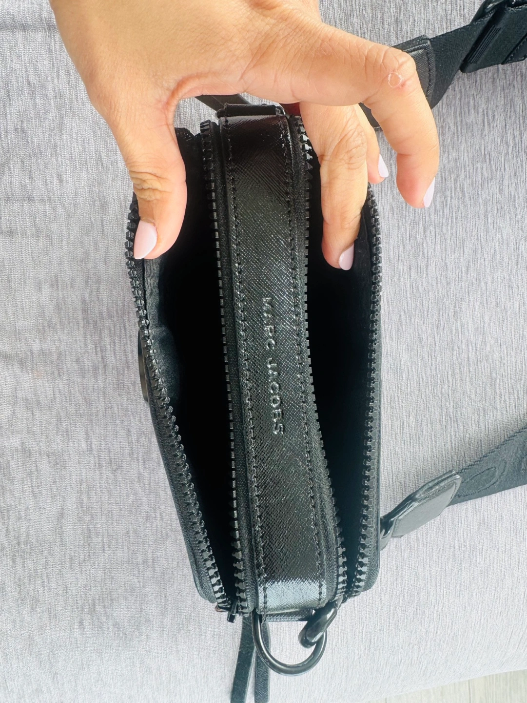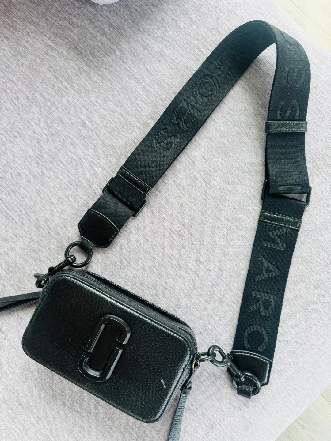 Marc Jacobs Black leather crossbody bag. Brought one and half years ago and It is Authentic. I used it normally like other that’s why there is small damage in it as picture . Minimalist design and very useful for free style.