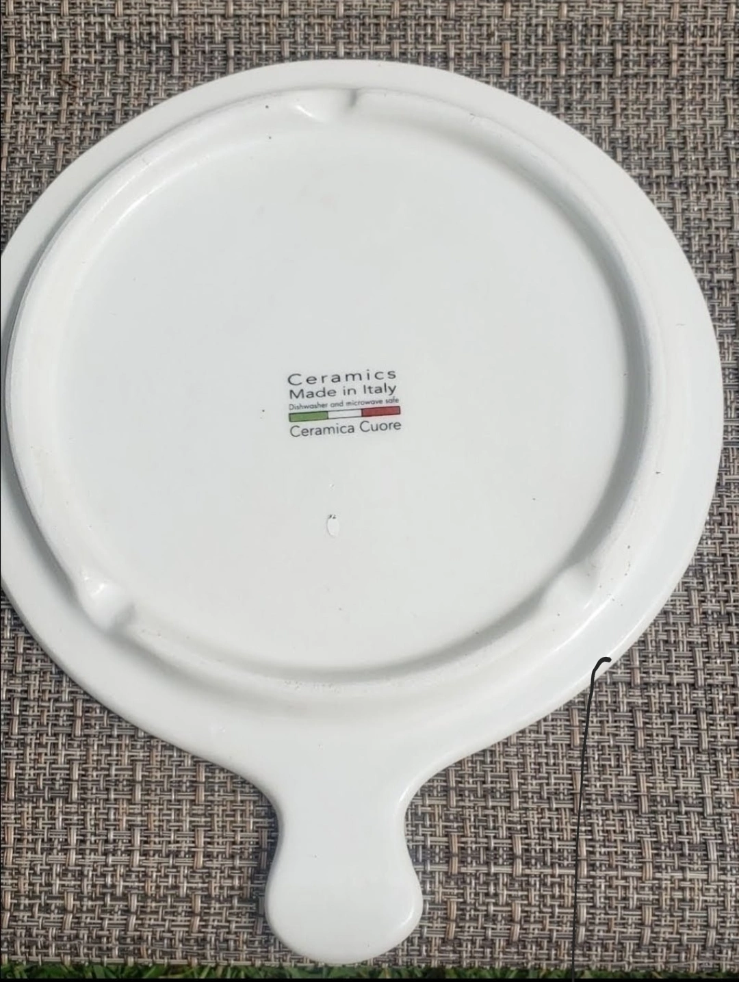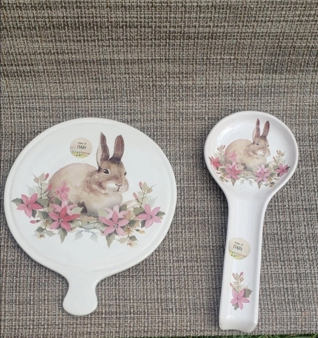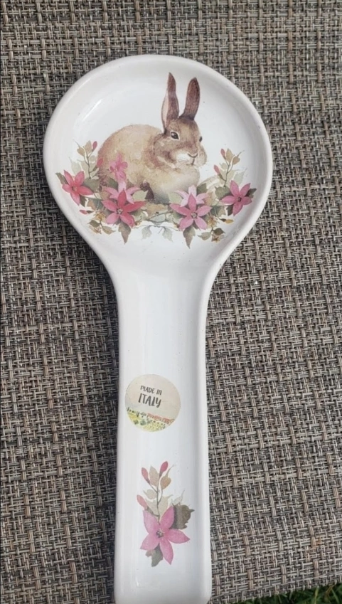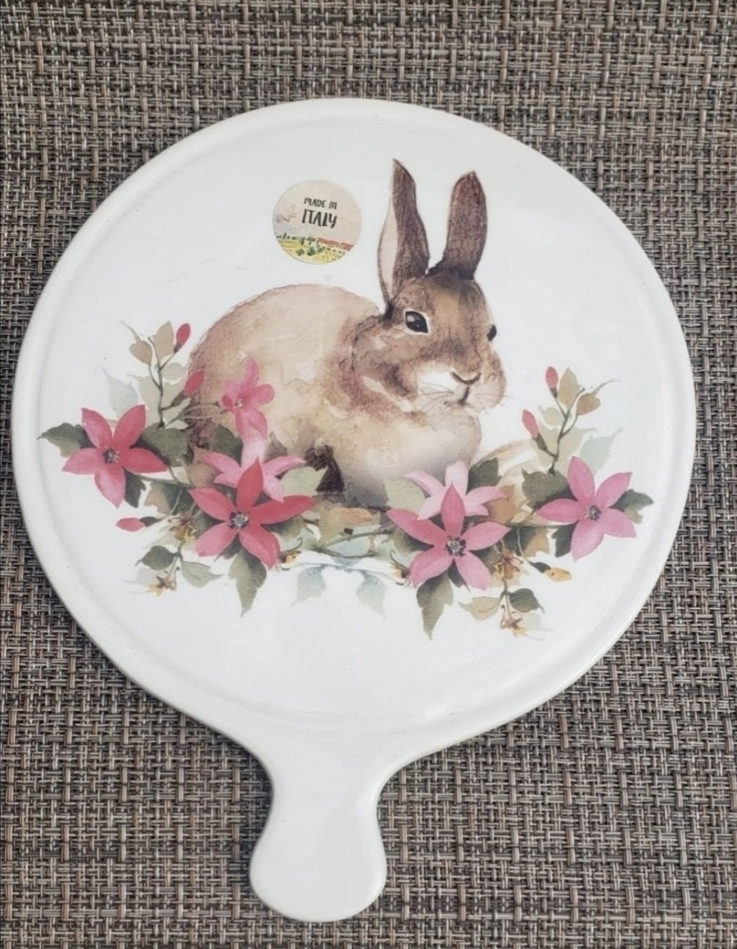 Adorable rabbit-themed spoon rest and hot pad set. Made in Italy. Ceramic material. Dishwasher and microwave safe. Features a charming rabbit surrounded by pink flowers.