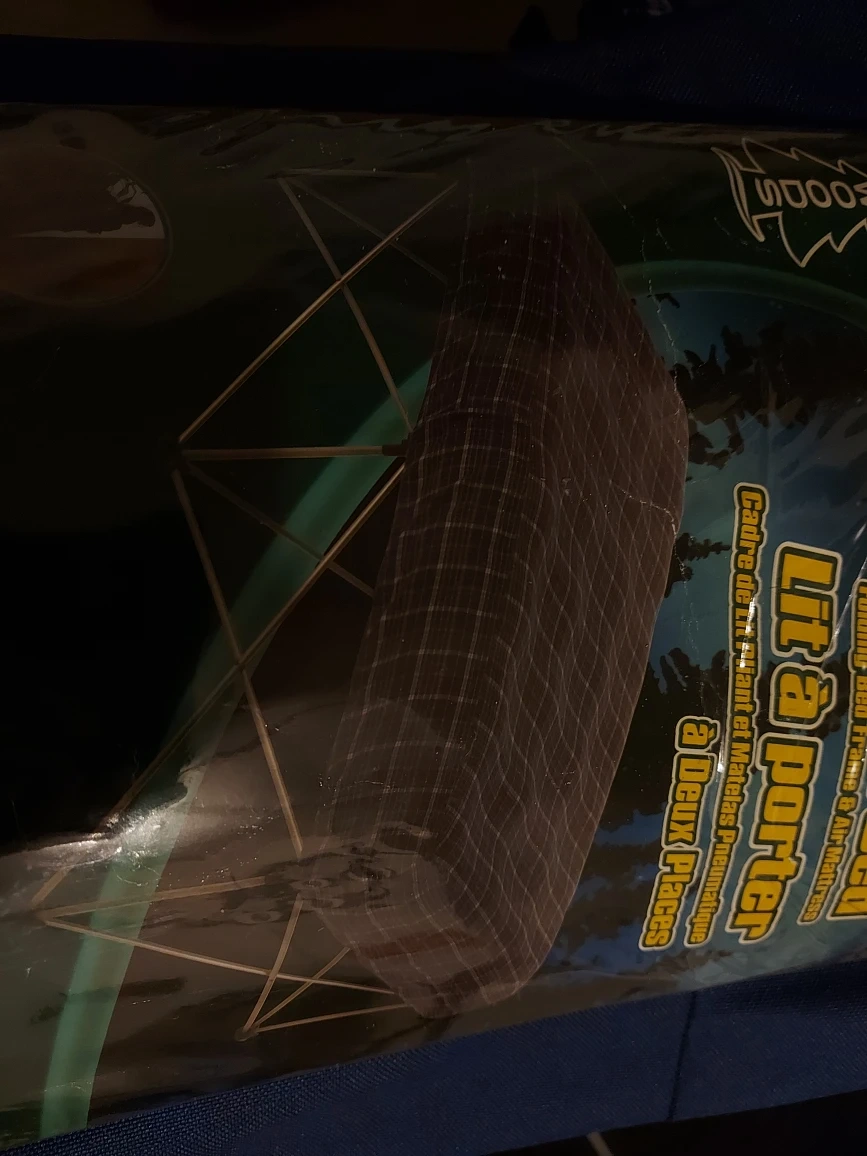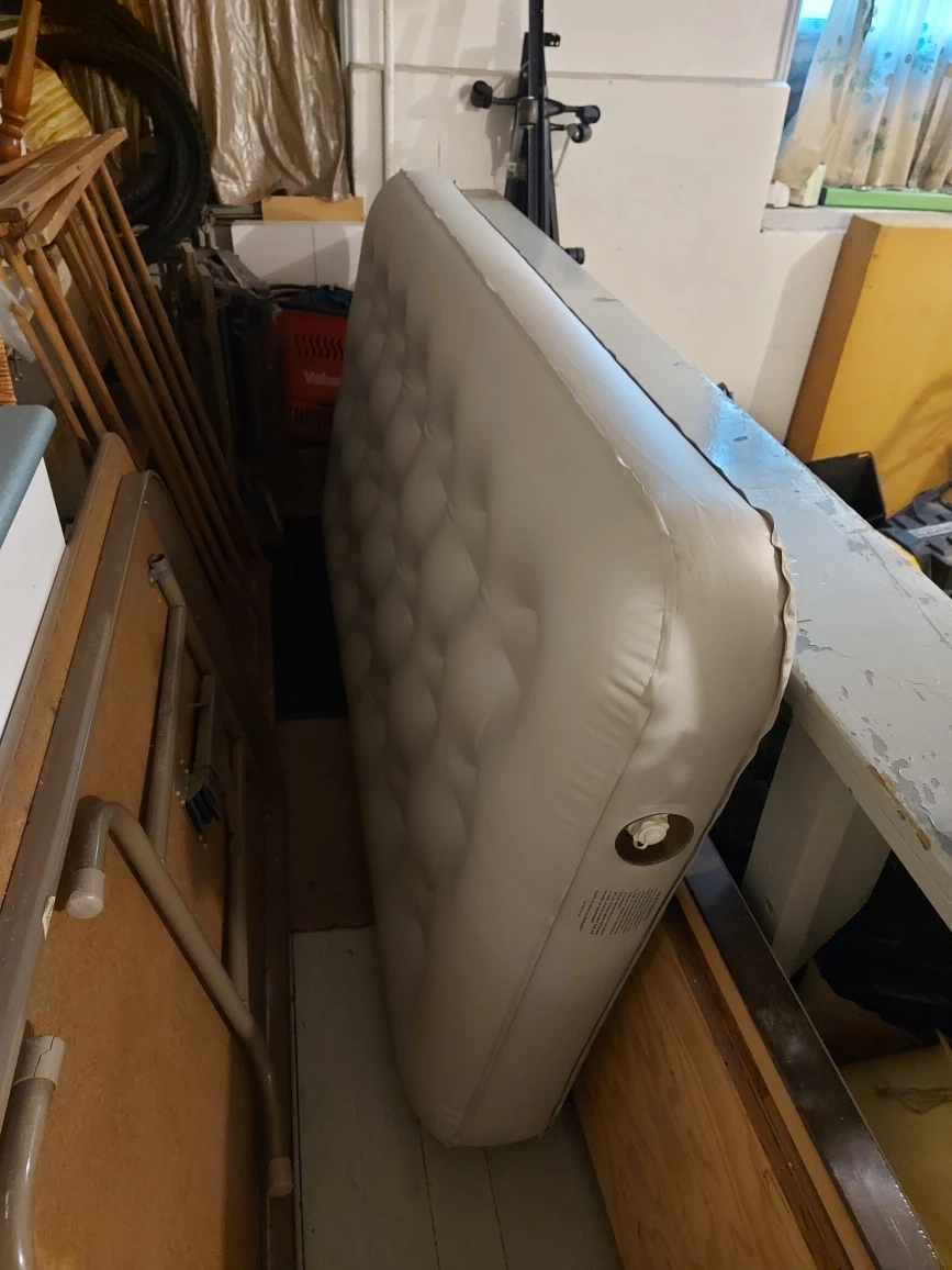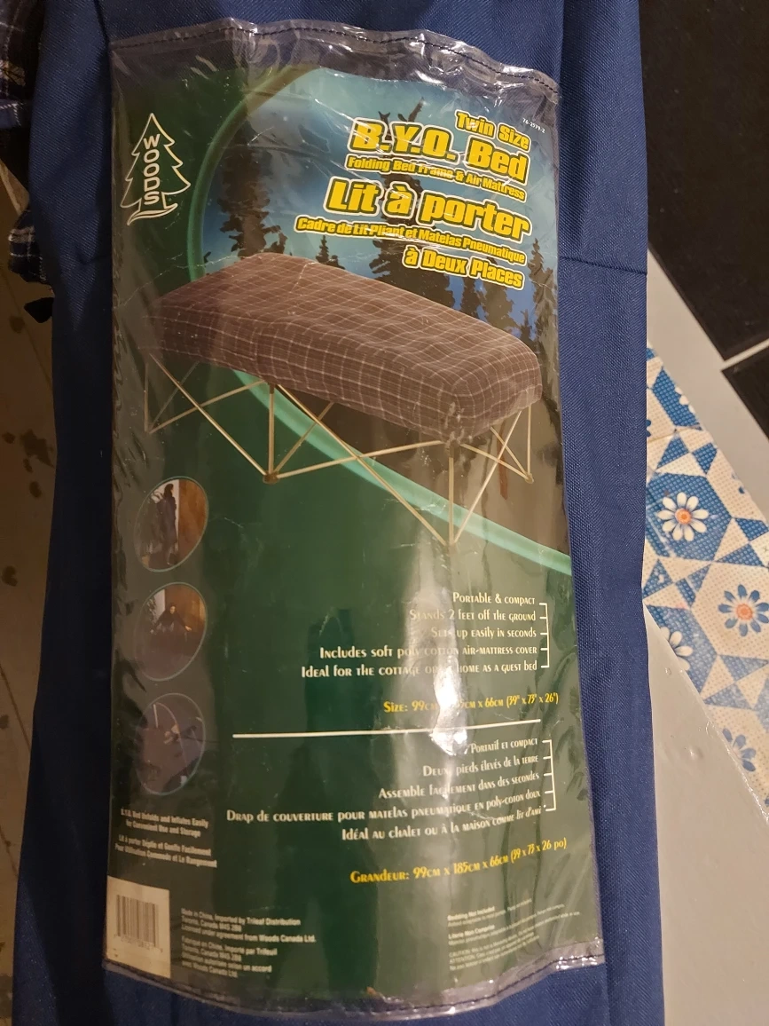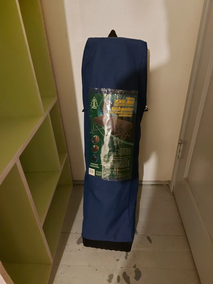 Almost never used but older guest bed or camping lit. Easy to use, metal frame folds out, and it comes with an inflatable mattress on top. We tested the mattress, and it holds the air.