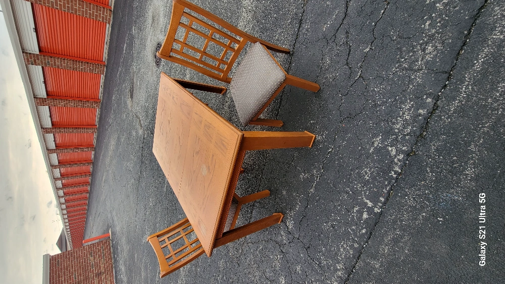 Solid oak wood dining table with six matching chairs. Simple design. Small table, good for small spaces. Minor wear.