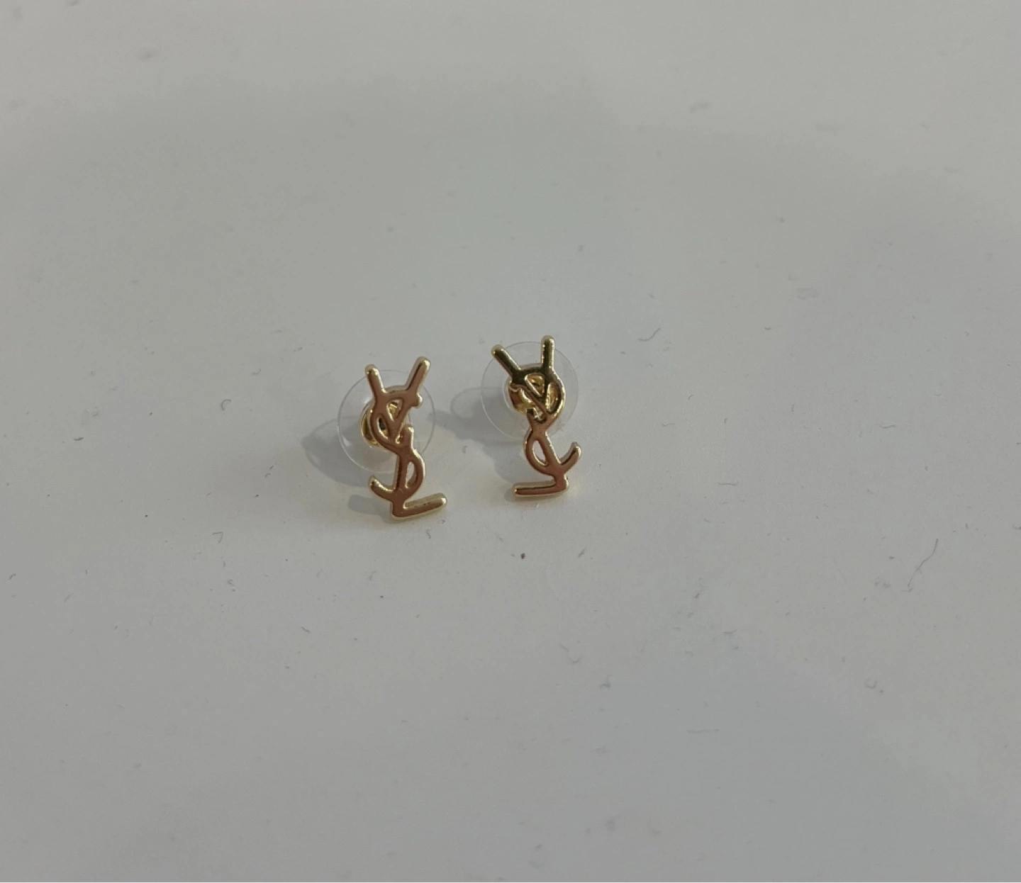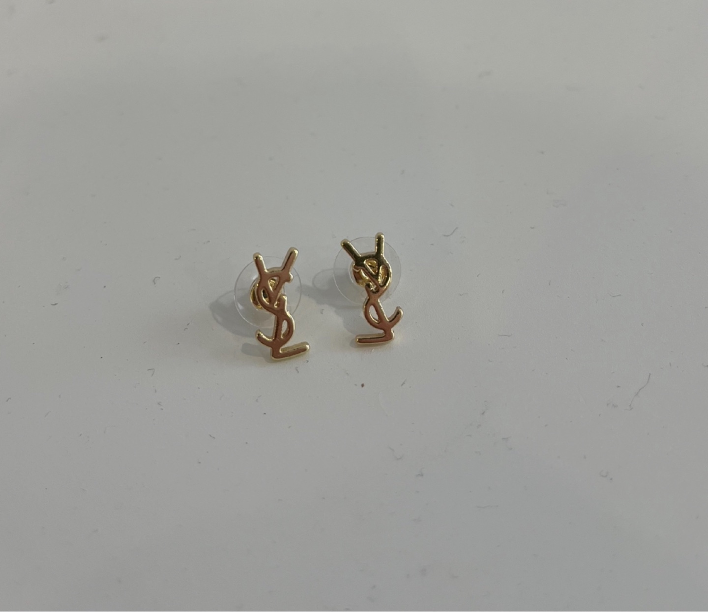 Pair of gold-tone Yves Saint Laurent logo stud earrings. Small, subtle design. Excellent for everyday wear.