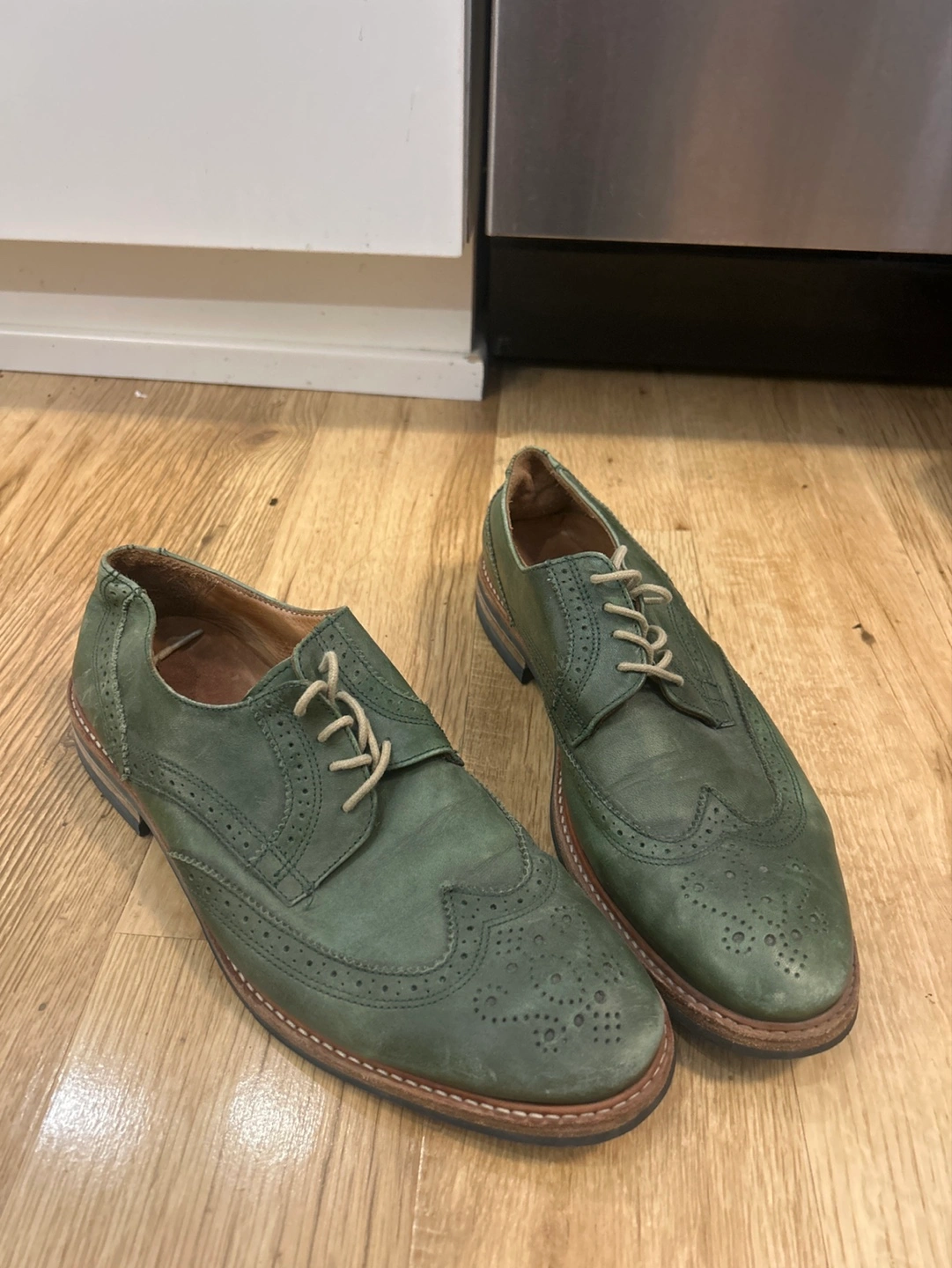 133Pair of men's green leather wingtip shoes. Lace-up closure. Slightly worn look.