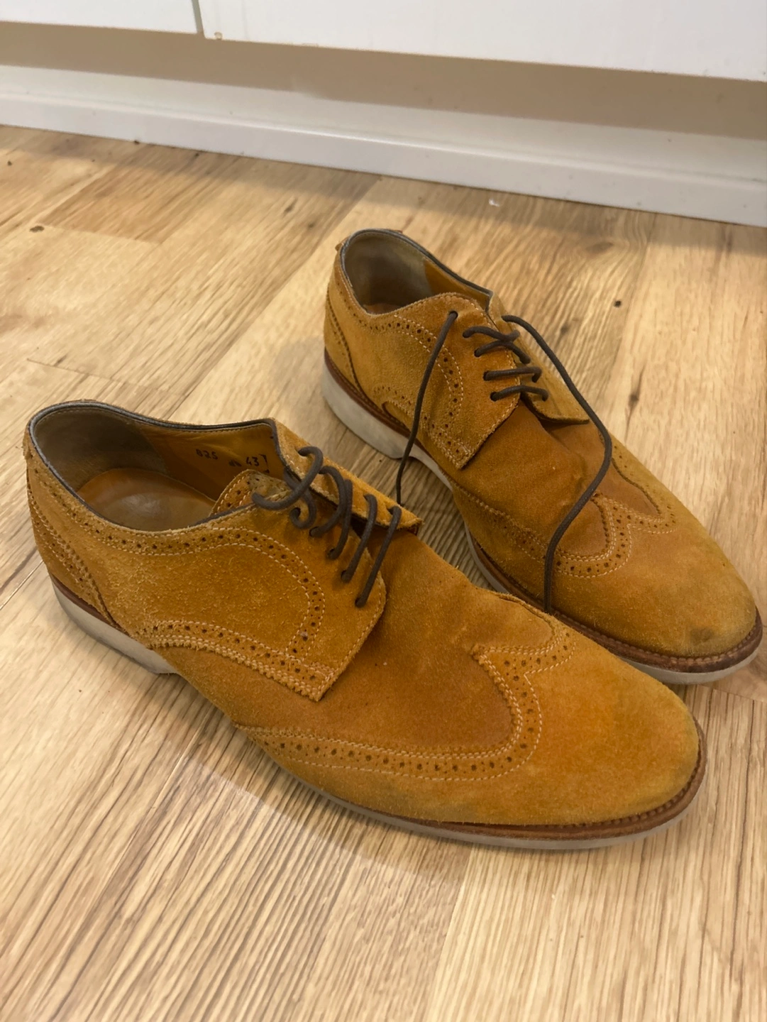 133Pair of men's brown suede wingtip oxfords. Lace-up closure. Slightly worn.