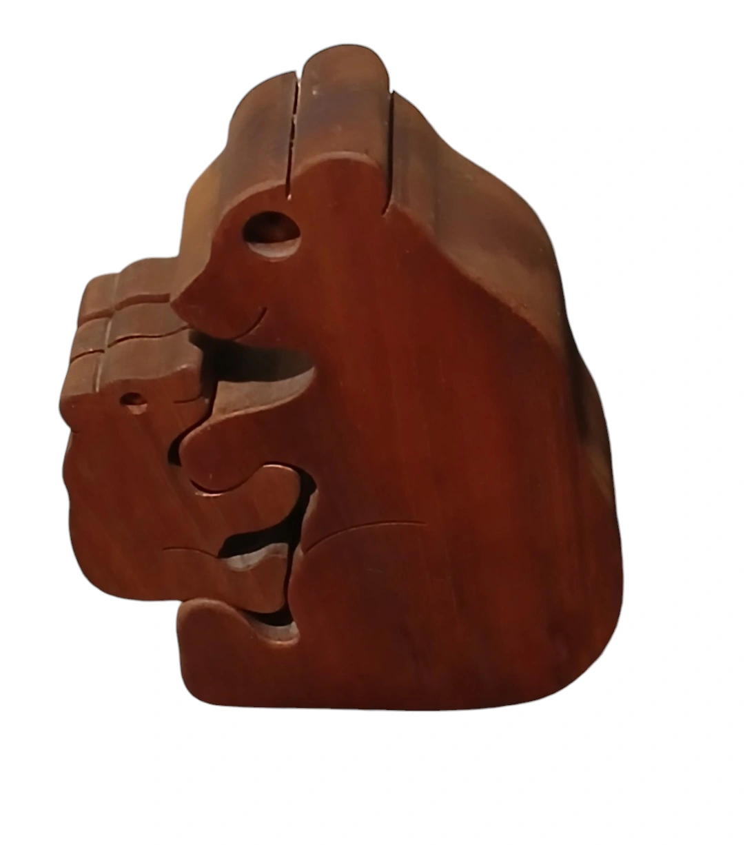 Intricate wooden puzzle. Mother bear and three cubs. Dark brown wood. Fun for all ages. Trade/$ell