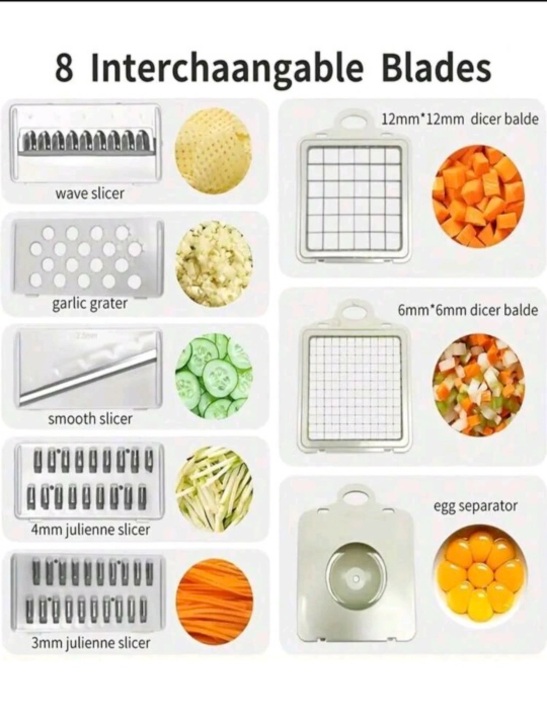 Vegetable chopper with 8 interchangeable blades. Includes various slicing, dicing, and grating attachments. Clear container for easy food collection. Great for prepping veggies!