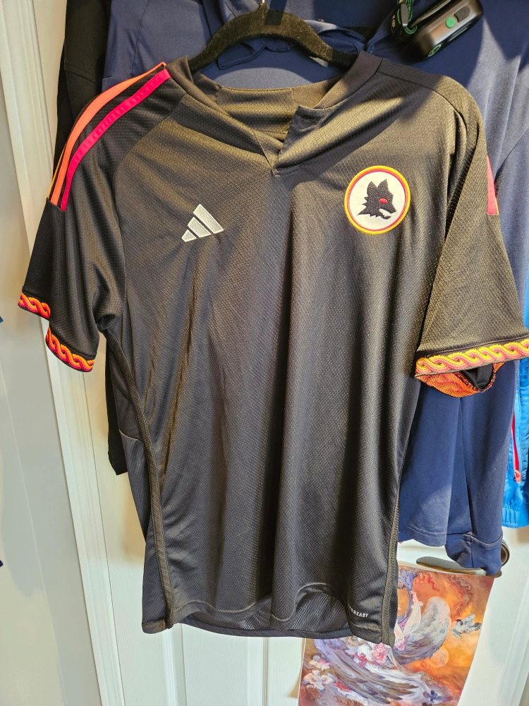 Men's AS Roma third jersey. Black with orange and red accents. Adidas Climacool technology. Short sleeves. Size and condition not specified.