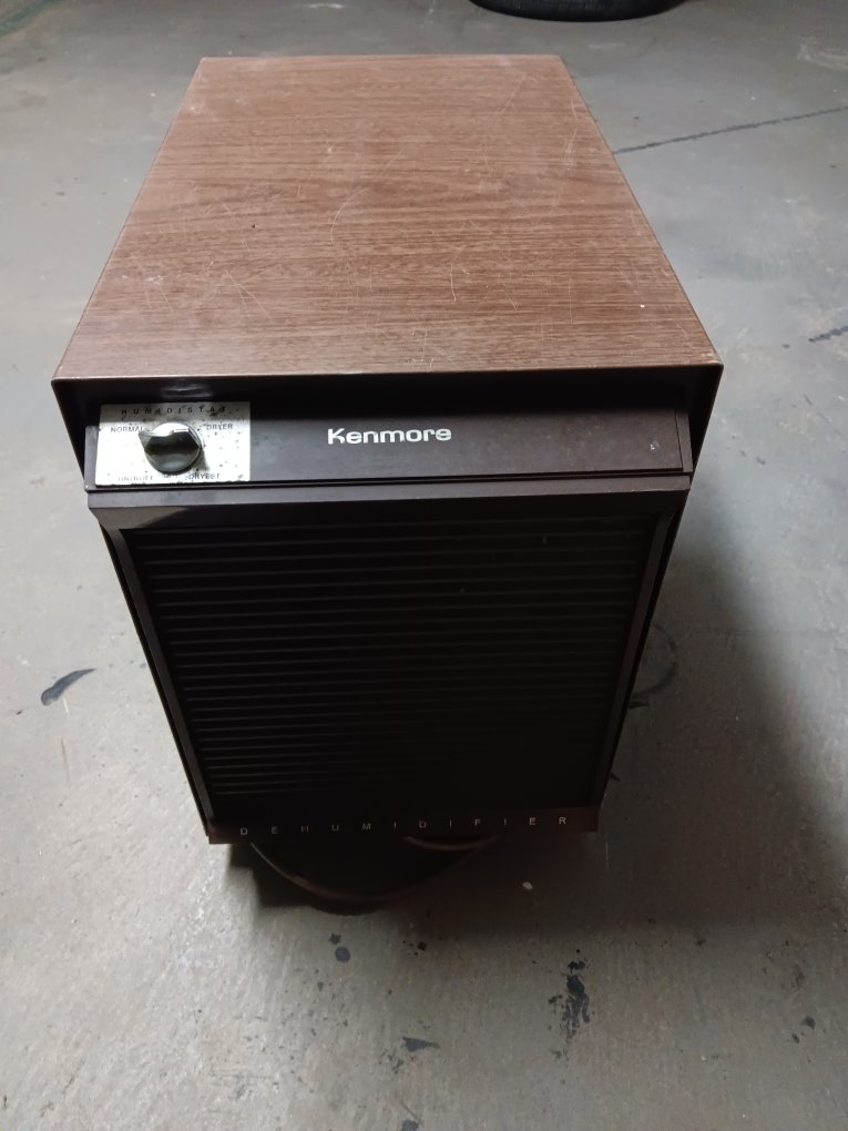 Brown vintage Kenmore dehumidifier. Features a simple control knob. Shows some wear.