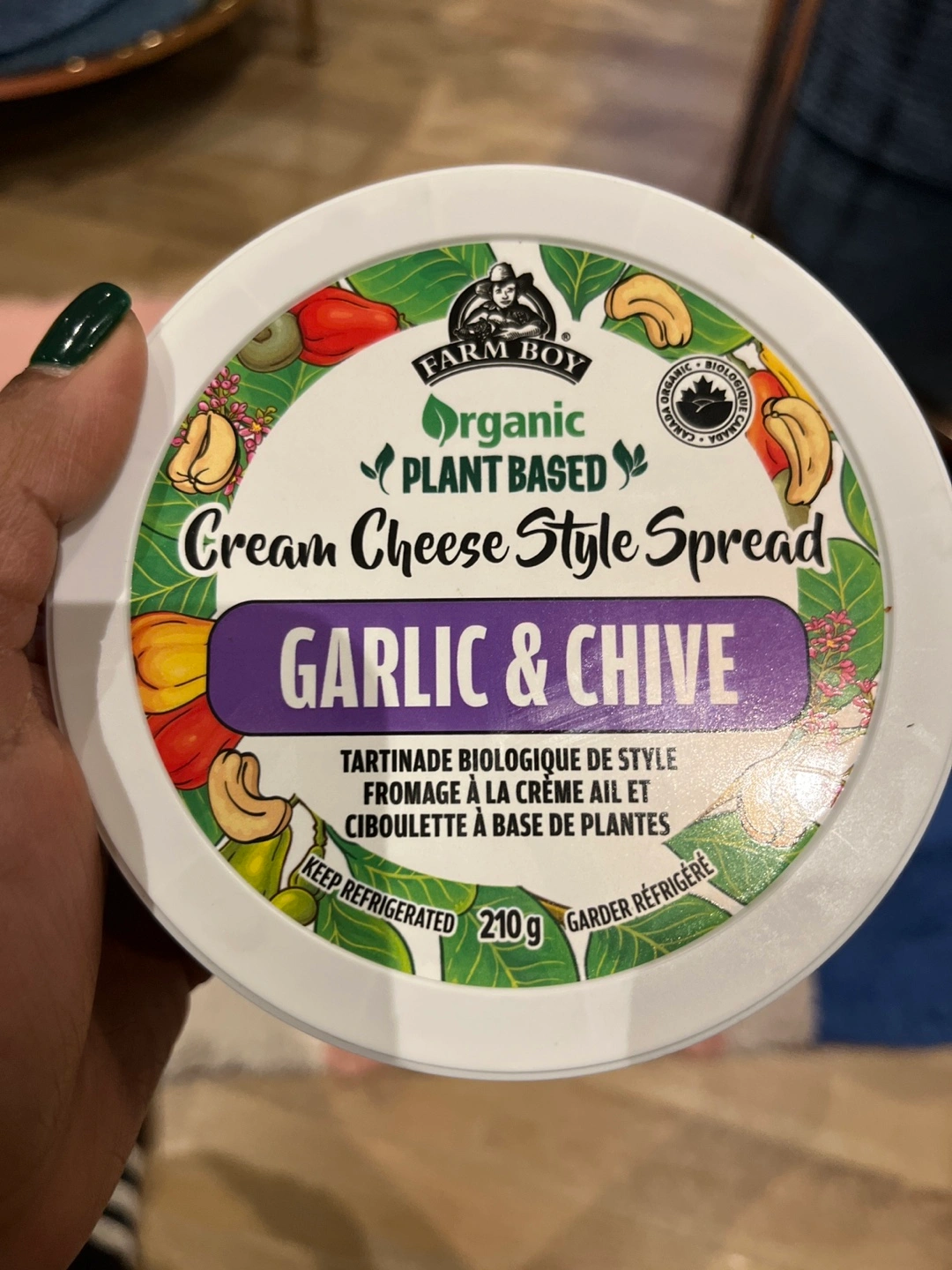 210g container of organic plant-based cream cheese style spread. Garlic & Chive flavour. Keep refrigerated.expiry may 25, i tried and didnt like it.