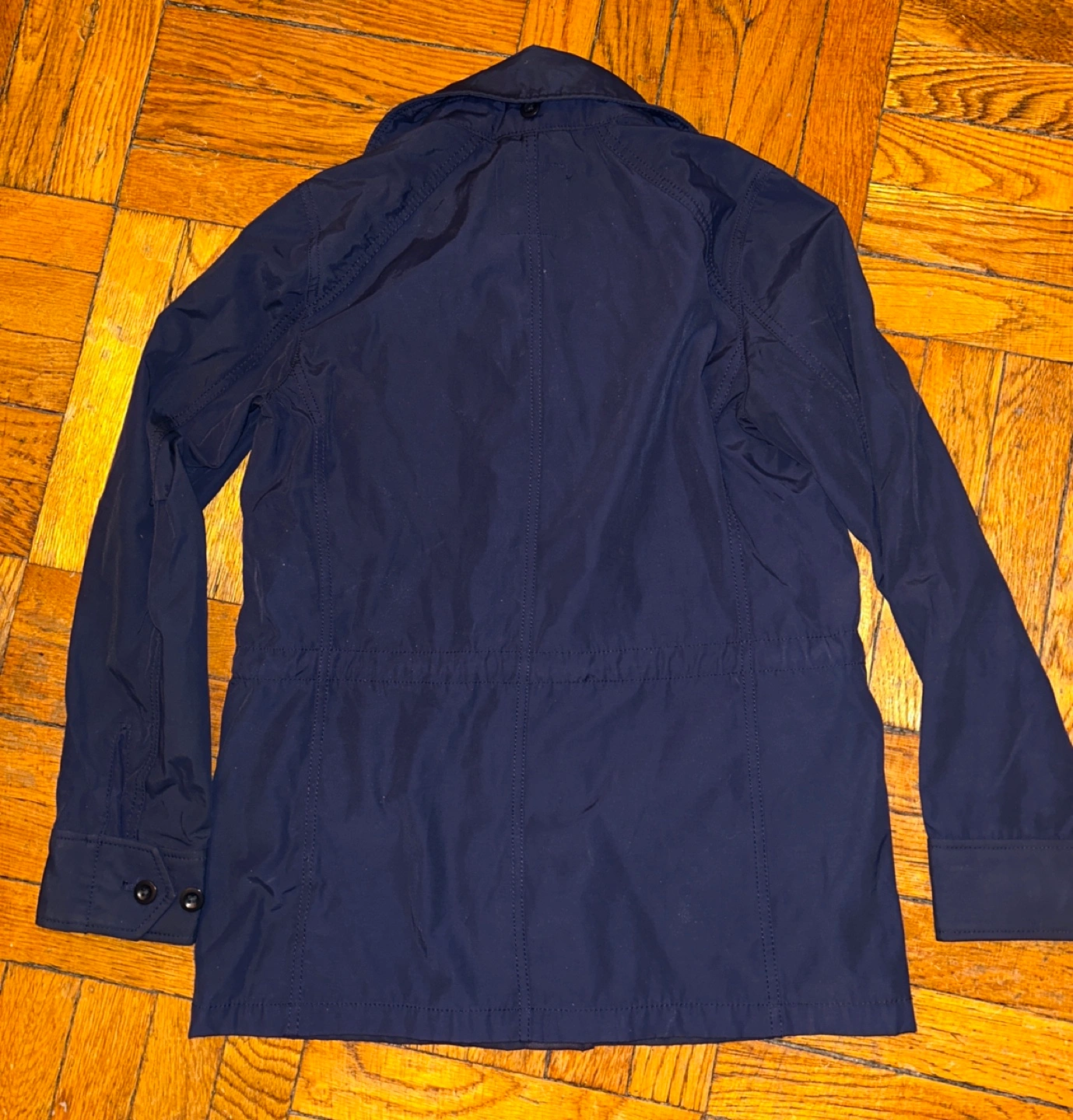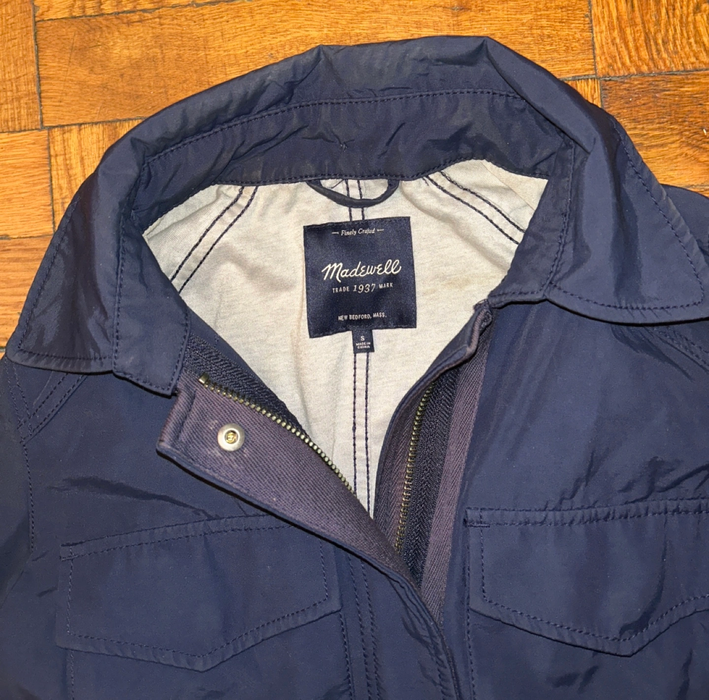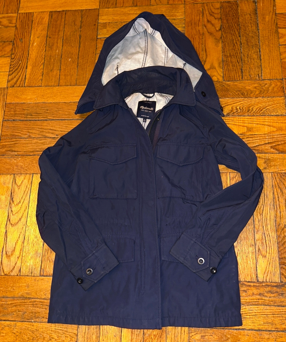 1000+Women's Madewell navy blue hooded jacket. Removable hood. Size small. Features multiple pockets and a drawstring waist. Front zip and snap closure. Lightweight material. Perfect for Spring. Excellent very gently loved condition. Original MSRP: $140!