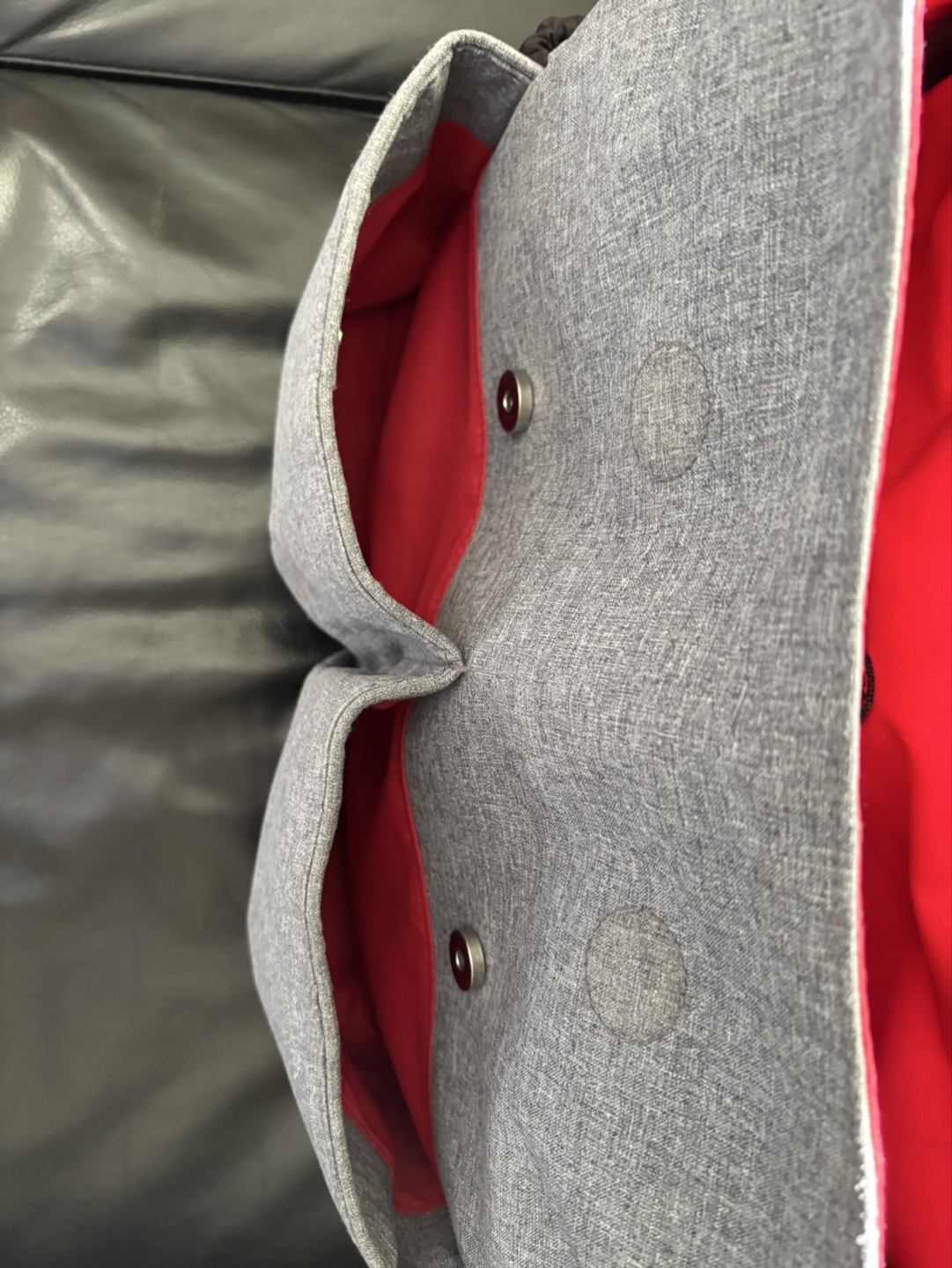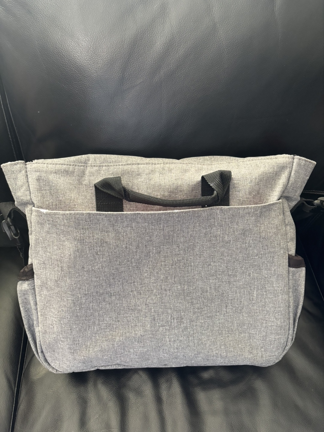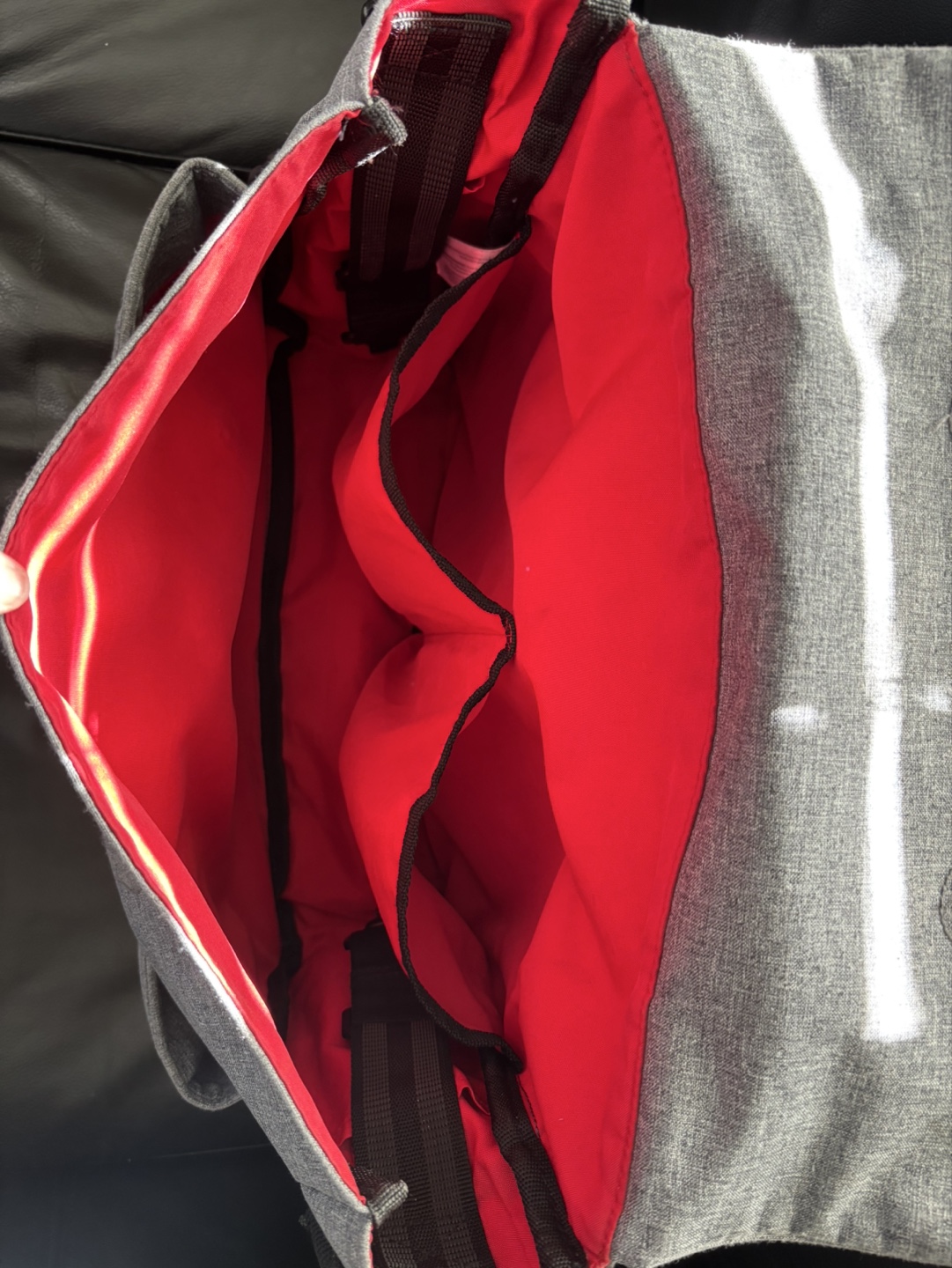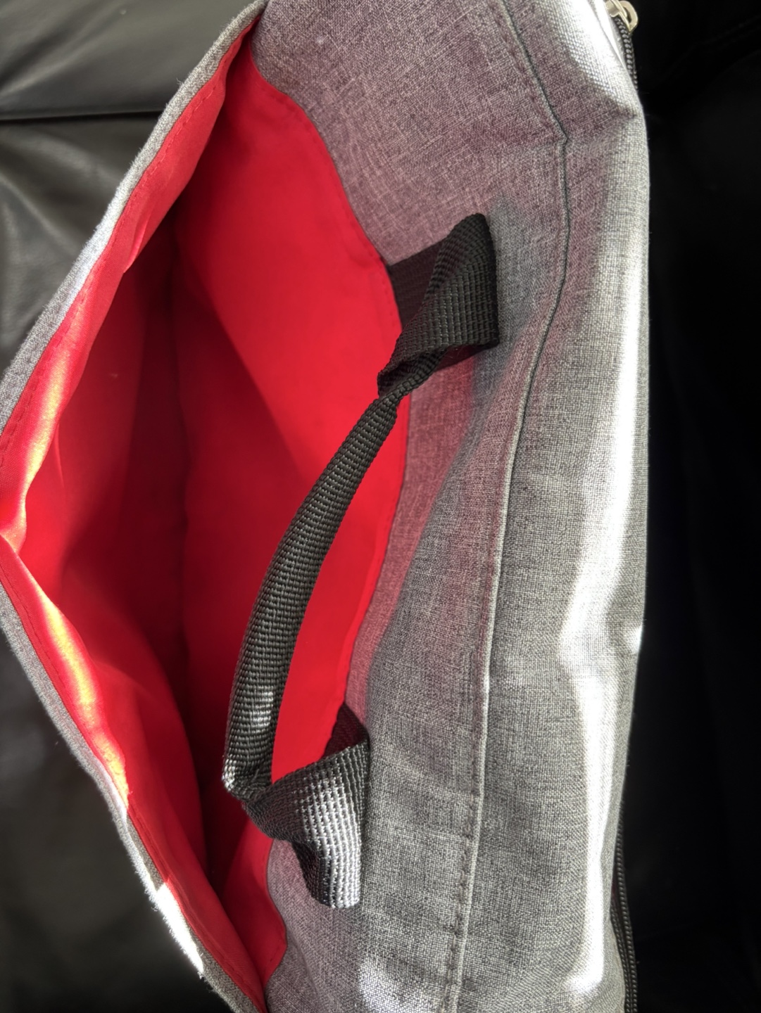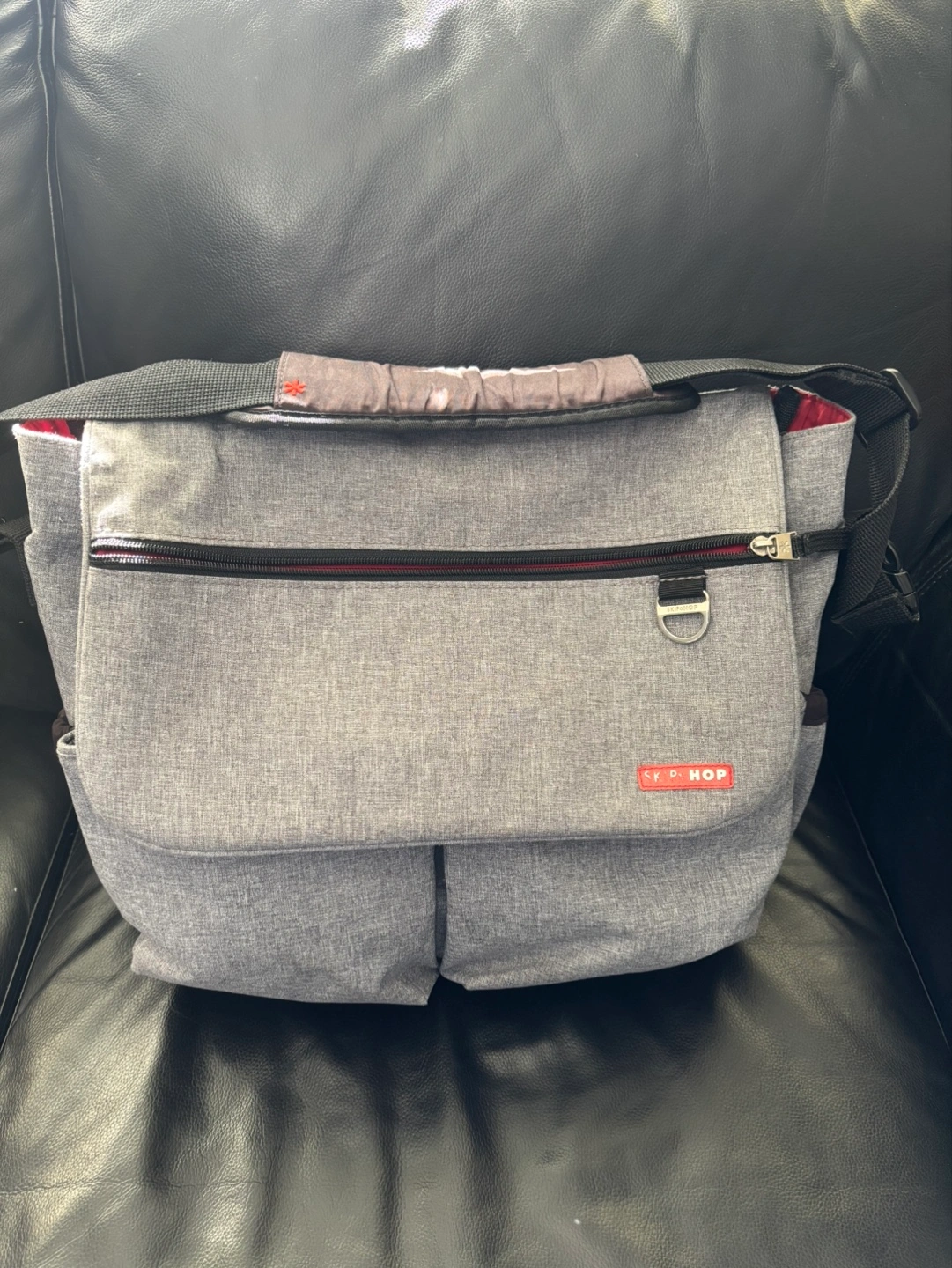 Grey Skip Hop diaper bag. Features multiple pockets and compartments. Red interior lining. Zipper closure. Adjustable shoulder strap. Top carry handles.