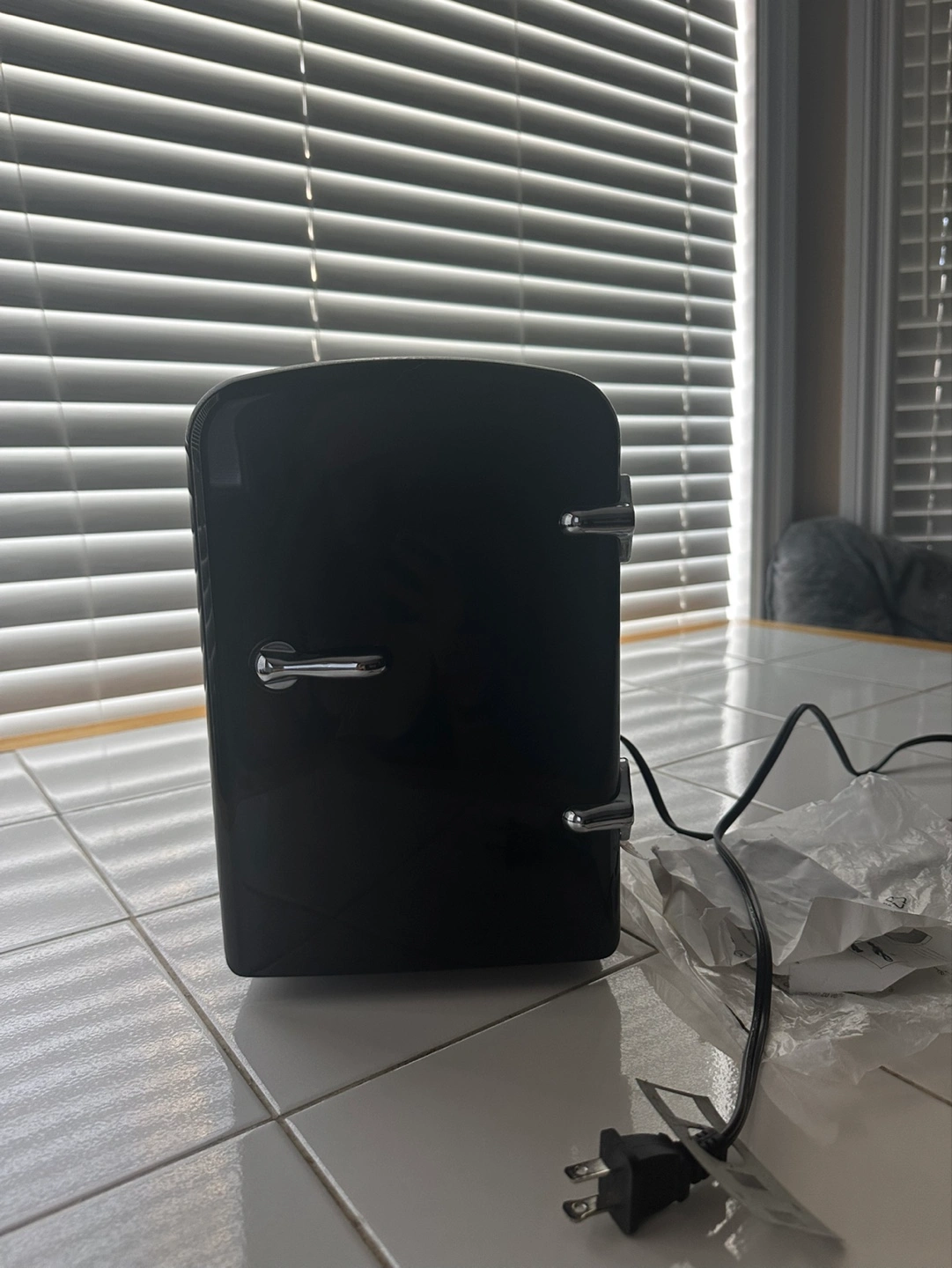 Black mini fridge. Small and compact. Includes AC and DC power cords. Perfect for dorm rooms, offices, or travel. The AC power function has stopped working for me- the fridge turns on but all the fan does is tick- does not spin, doesn’t cool or warm. The DC power function works though (when I plug into my vehicle through the cigarette lighter port) but the fan is extremely loud. Giving away to someone who wants to either fix it or use it for parts.