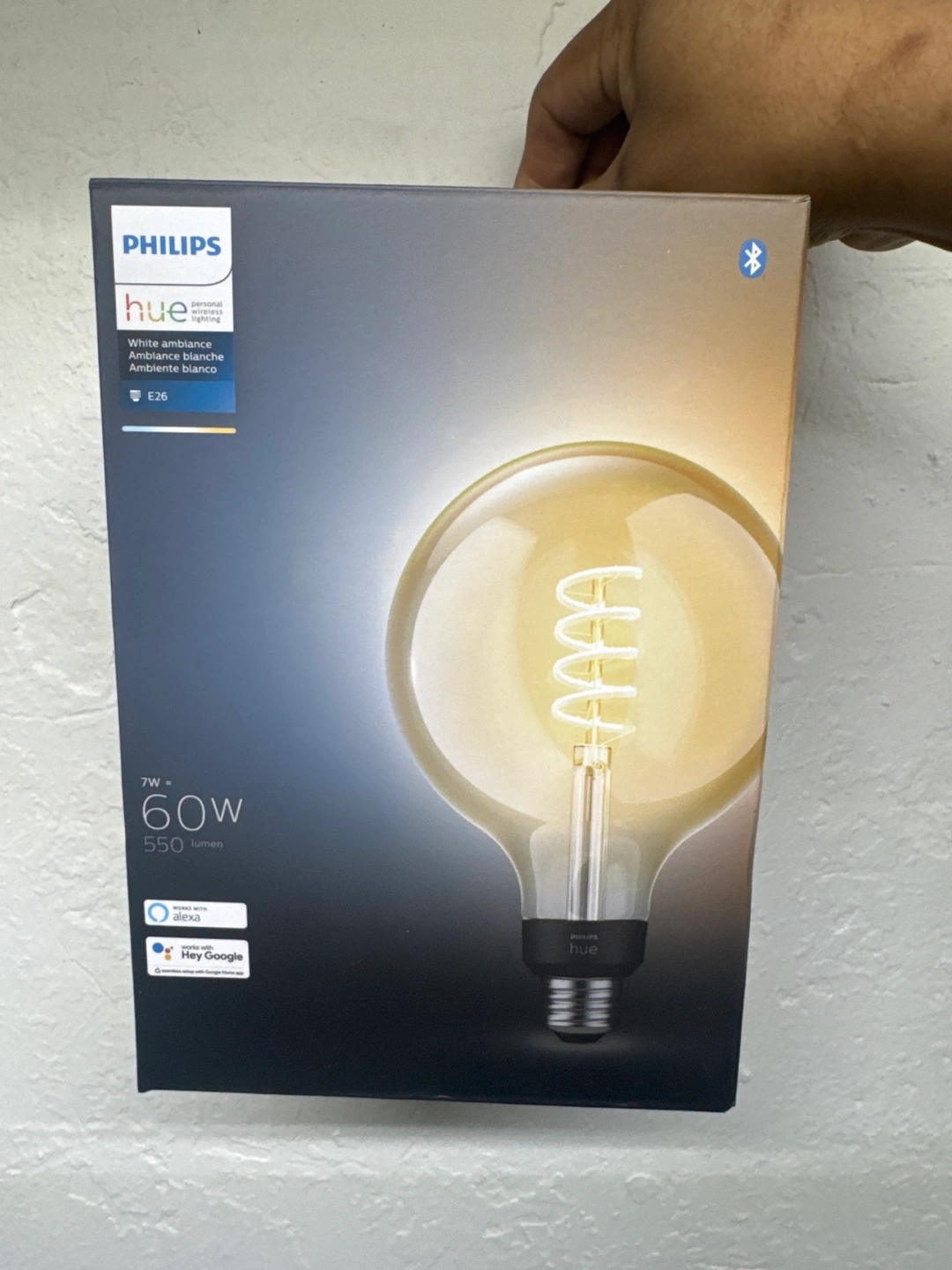 Smart bulb, E26 base. Works with Alexa and Google. 7W, 550 lumens. Bluetooth.