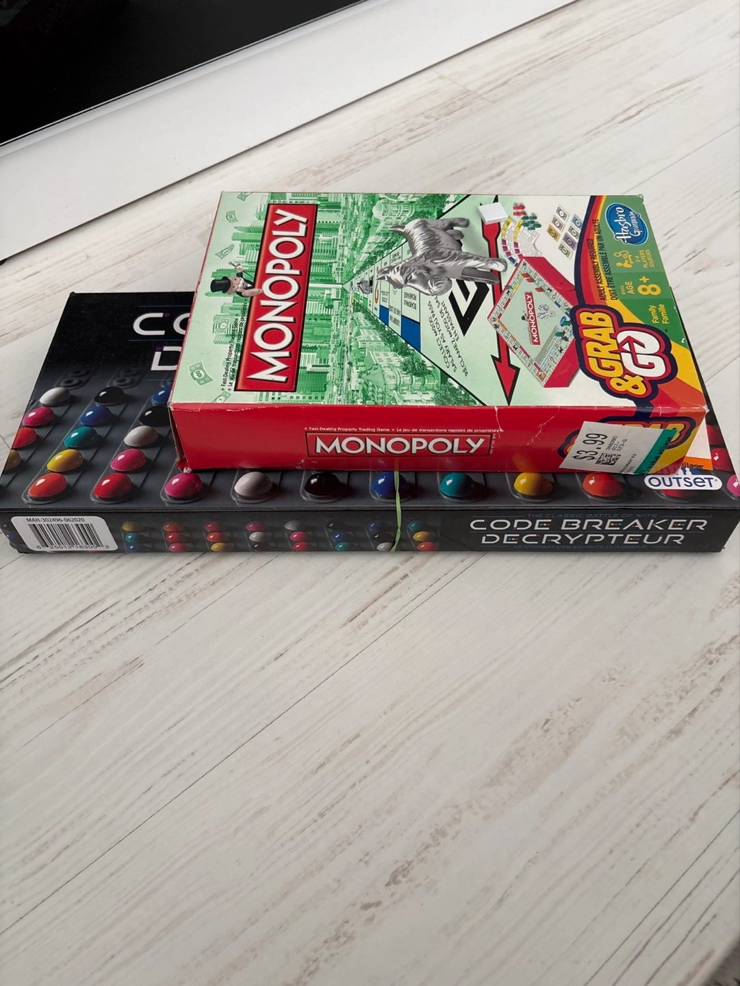 Two board games: Monopoly Grab & Go, a fast-paced version of Monopoly; and Code Breaker, a classic code-breaking game. Both games appear to be complete.