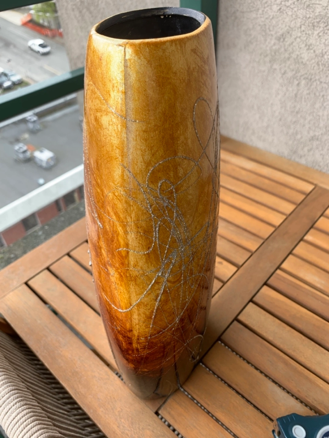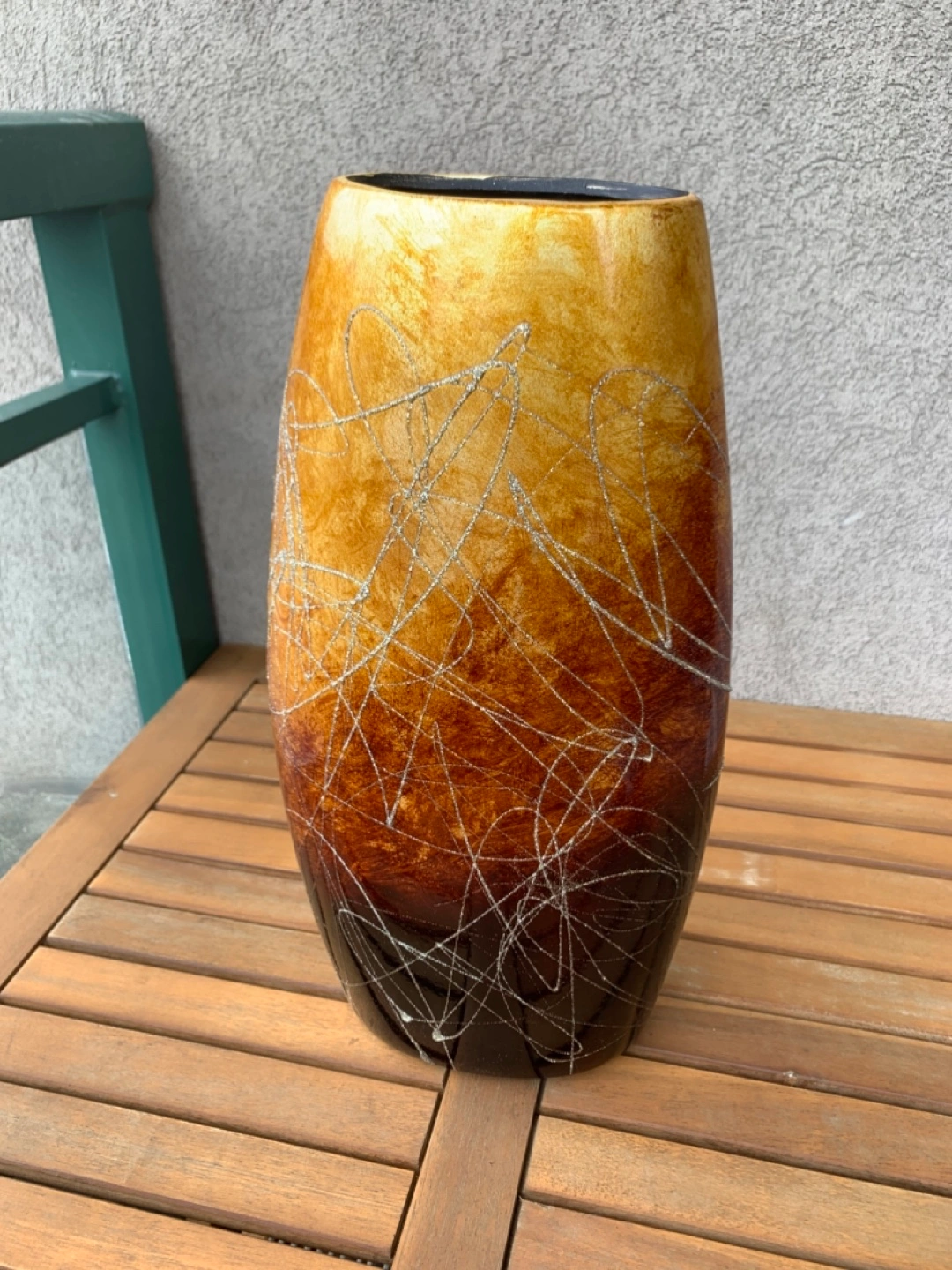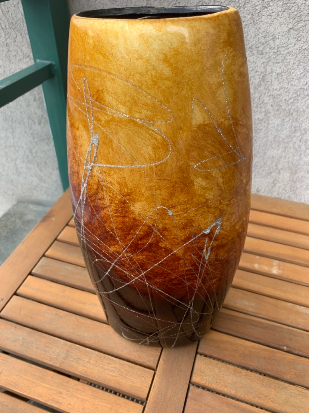 Tall ceramic vase. Brown and gold ombre effect. Silver line accents. Approximately 18 inches tall. Great for home decor.