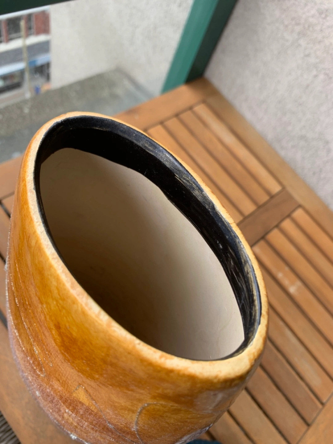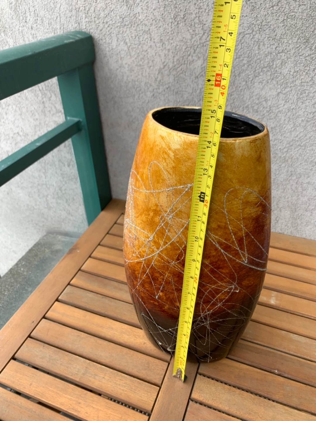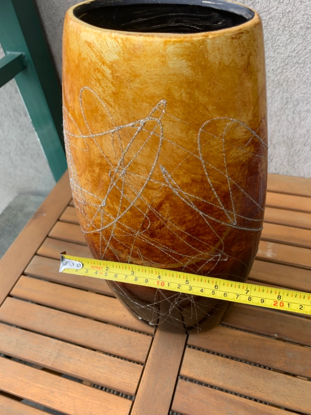 Tall ceramic vase. Brown and gold ombre effect. Silver line accents. Approximately 18 inches tall. Great for home decor.