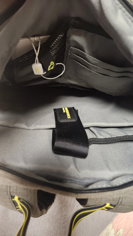 Grey backpack. Multiple compartments. Backpack features yellow accents. Comfortable design. Brand new.