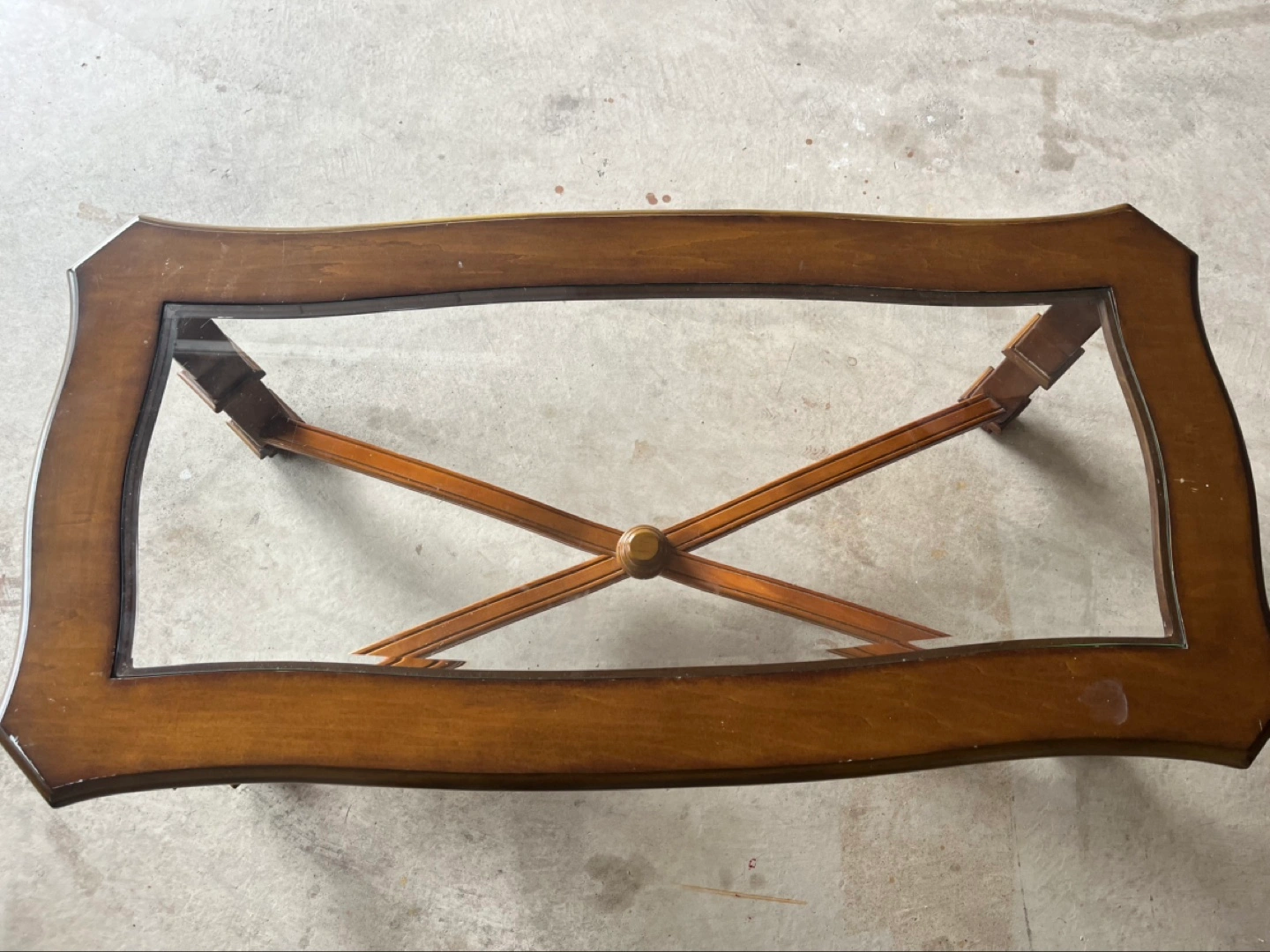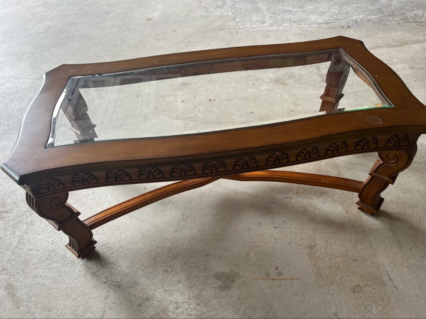 Elegant coffee table. Features a glass top and a dark brown wooden frame with carvings. X-shaped support. Four ornate legs.