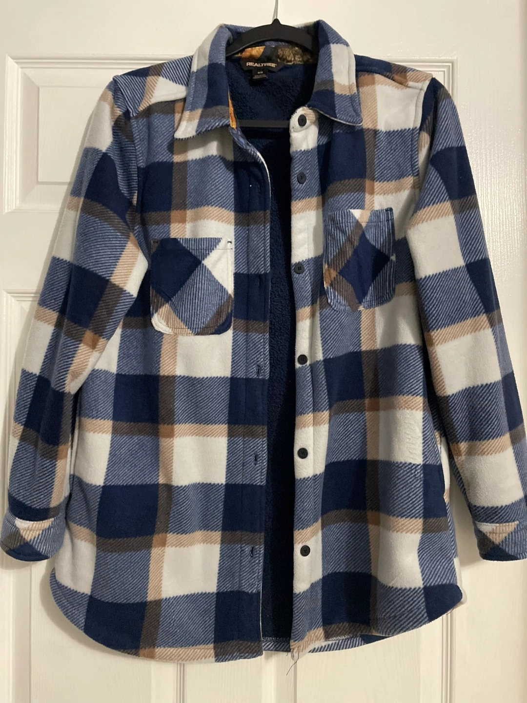 Medium flannel-lined shirt jacket. Blue, white, and brown plaid pattern. Soft fleece lining. Button closure. Long sleeves. Two chest pockets.