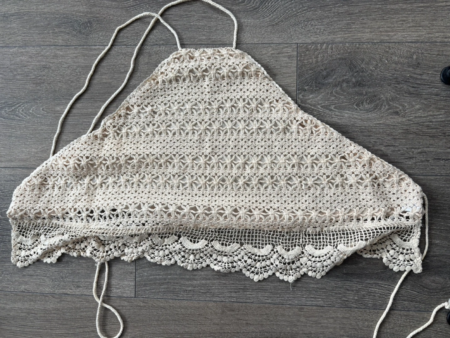 1000+Beautiful crocheted halter top. Features a cream colour and intricate detailing. Adjustable neck ties. Lightweight and perfect for summer.