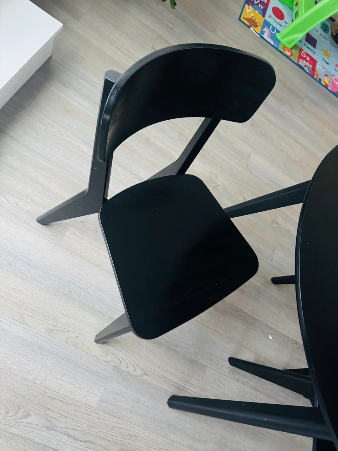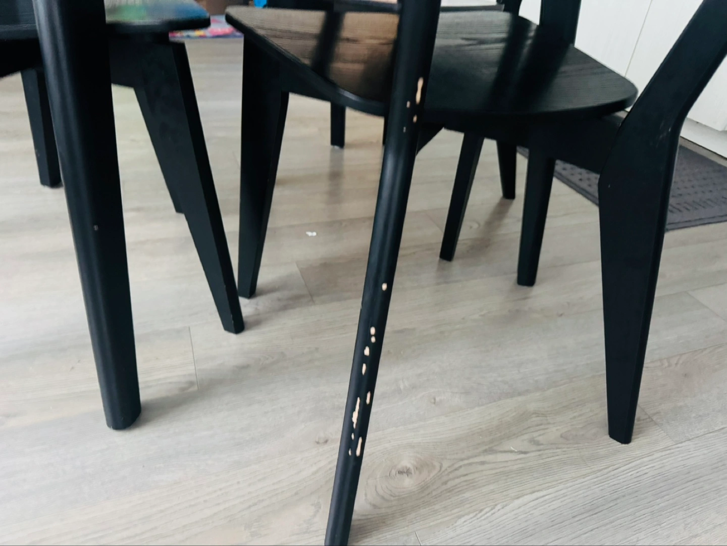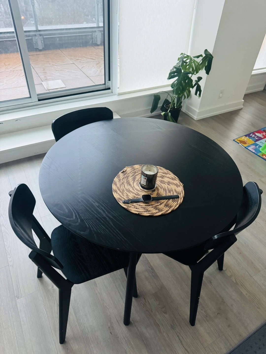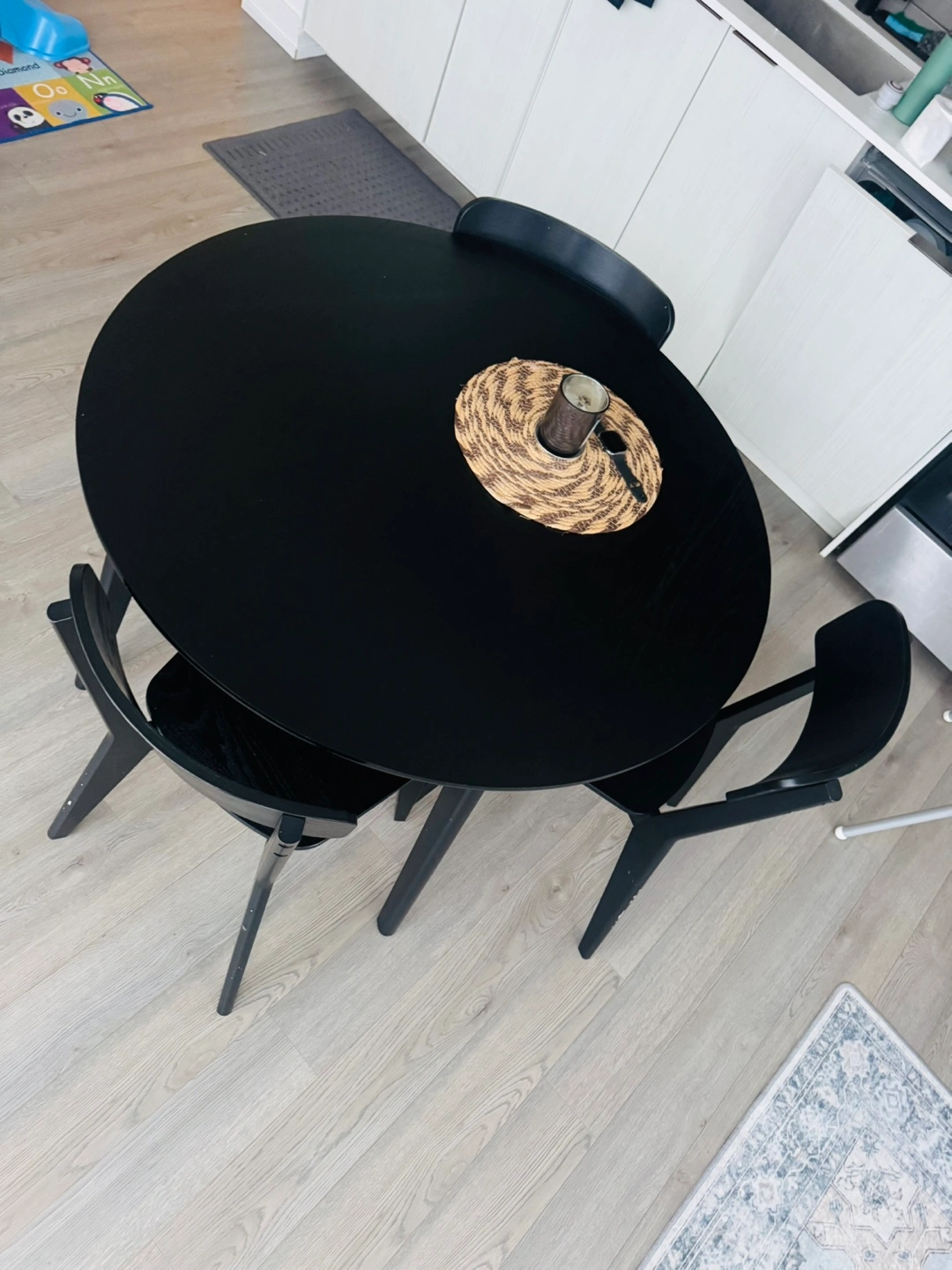 Small round black dining table for small family or minimalist style. 3 included black chairs. Minor wear and tear on chair legs.