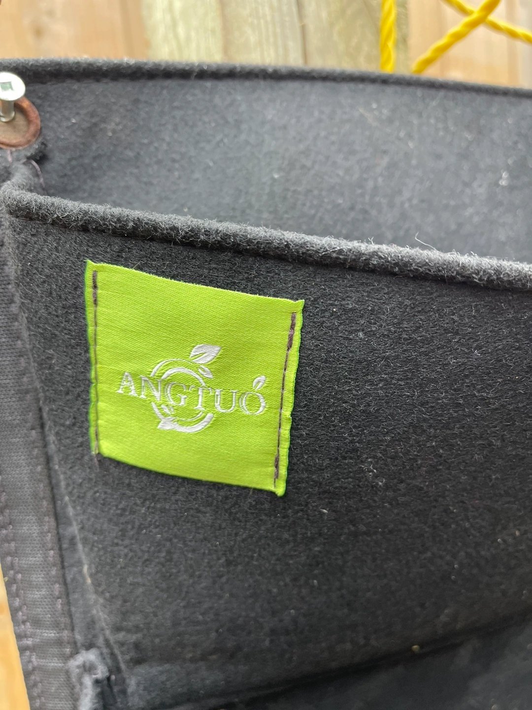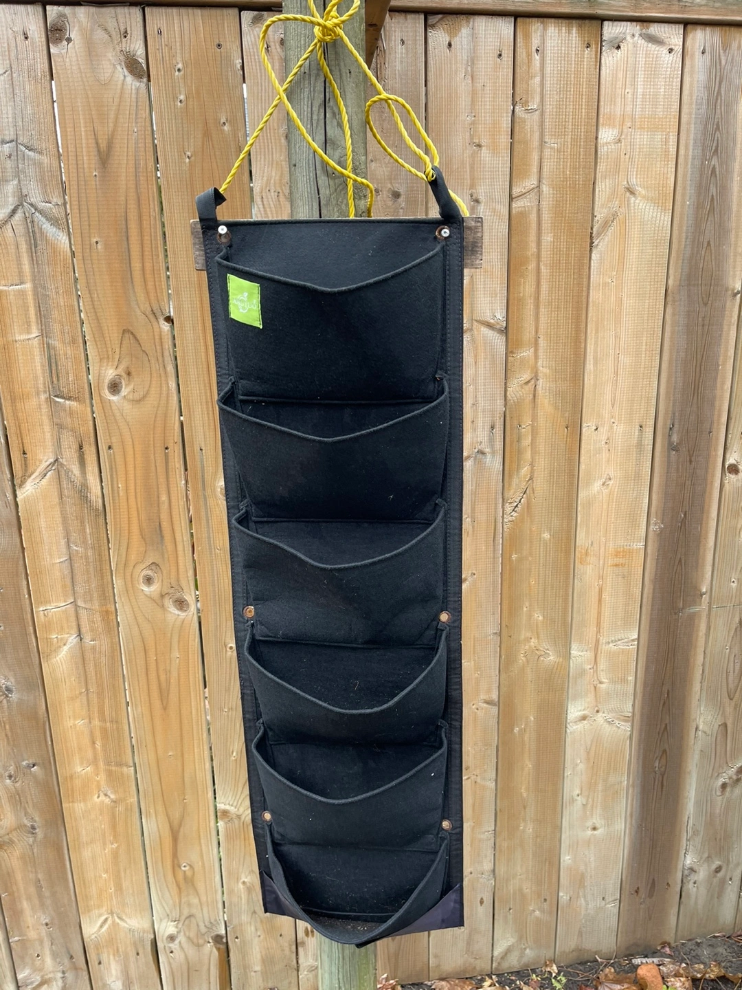 Black felt vertical wall planter. Six pockets. Great for herbs or small plants. Includes homemade hanging hardware. Used last summer only.