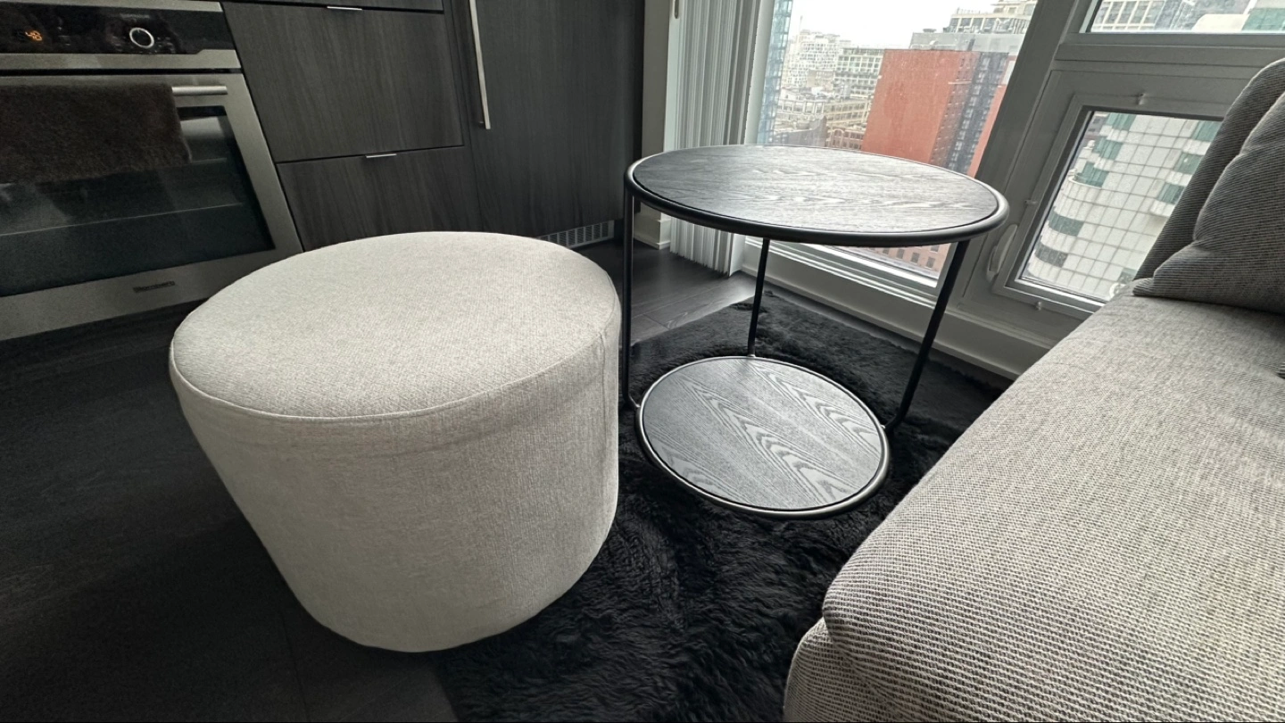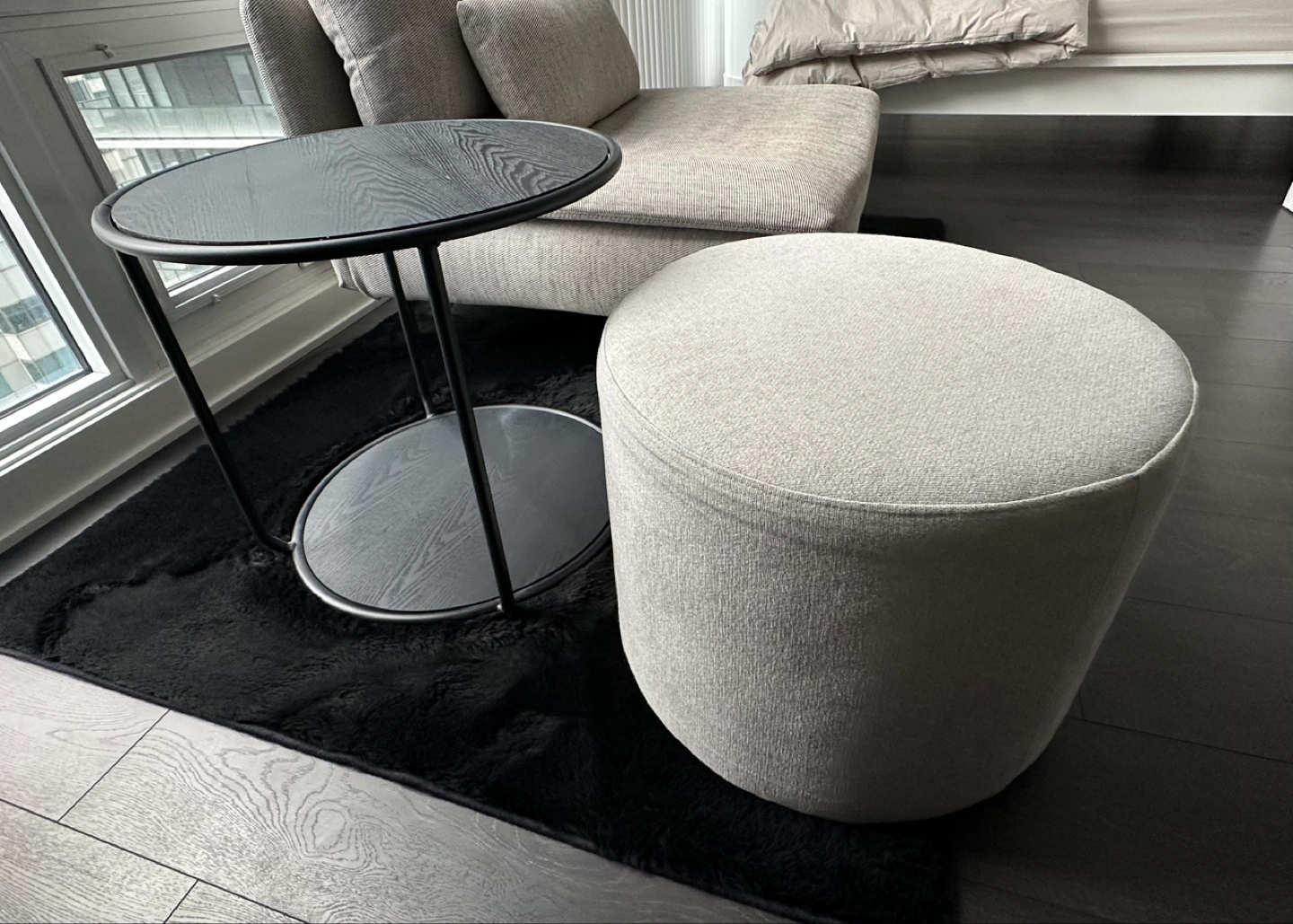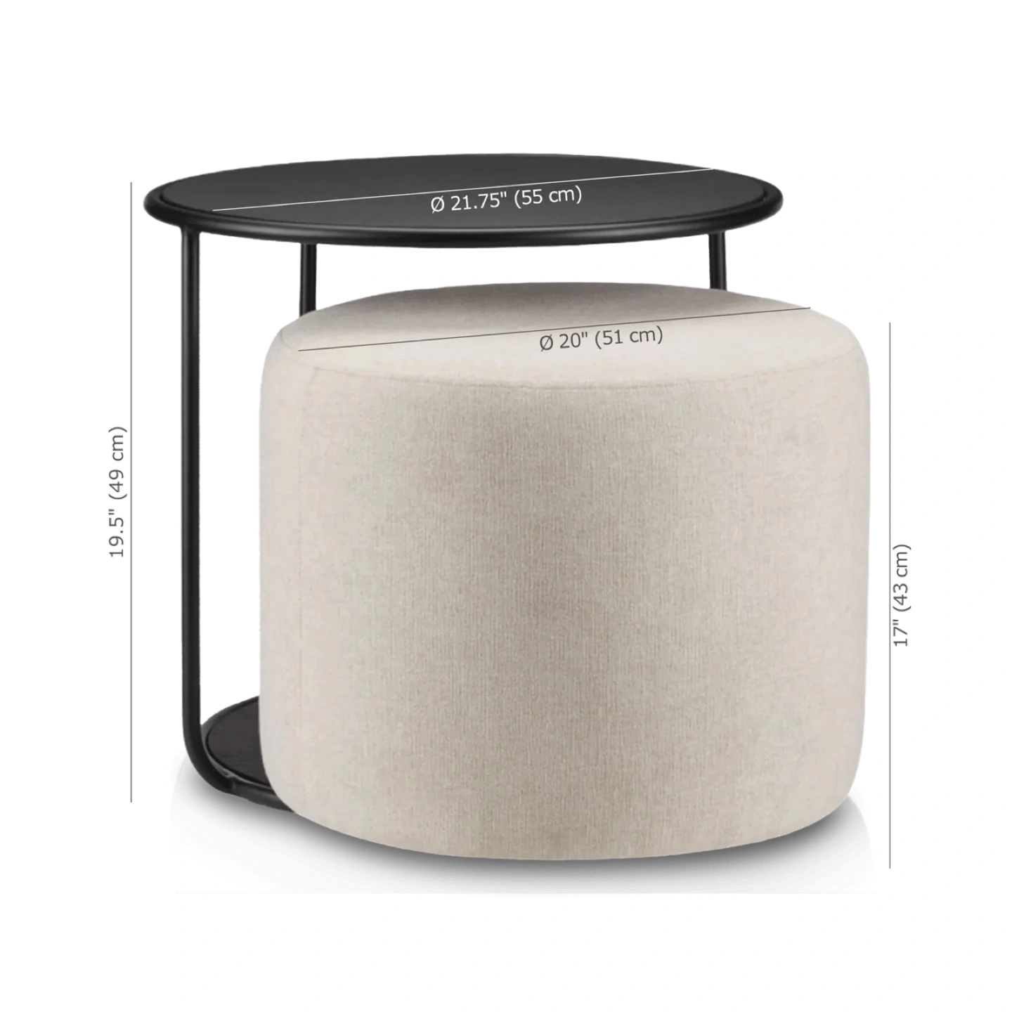 Modern black side table with beige ottoman set for both comfort and easy storage.