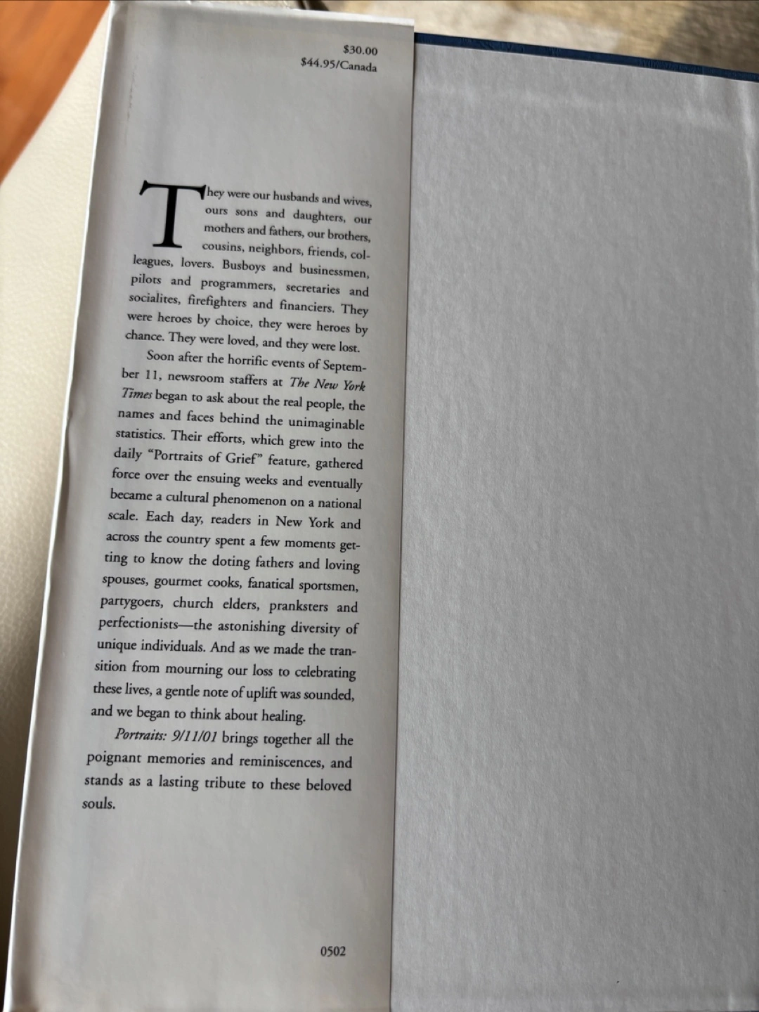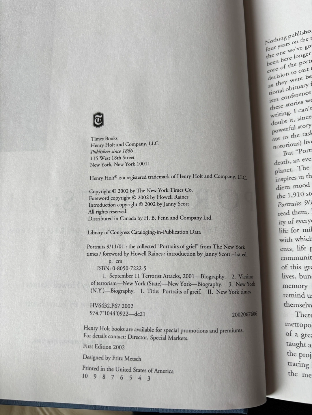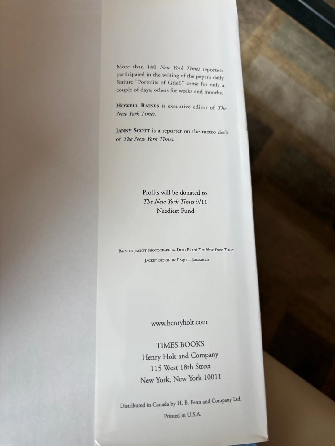 Hardback book. Collected portraits of grief from The New York Times. Foreword by Howell Raines. Introduction by Janny Scott. Times Books. Henry Holt and Company. From a pet and smoke free home. Pickup only in the St Lawrence market area of downtown Toronto. Cash only.
