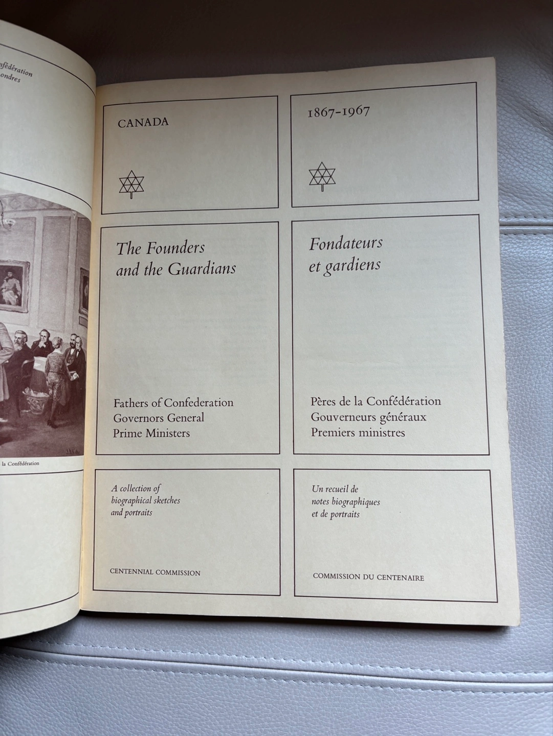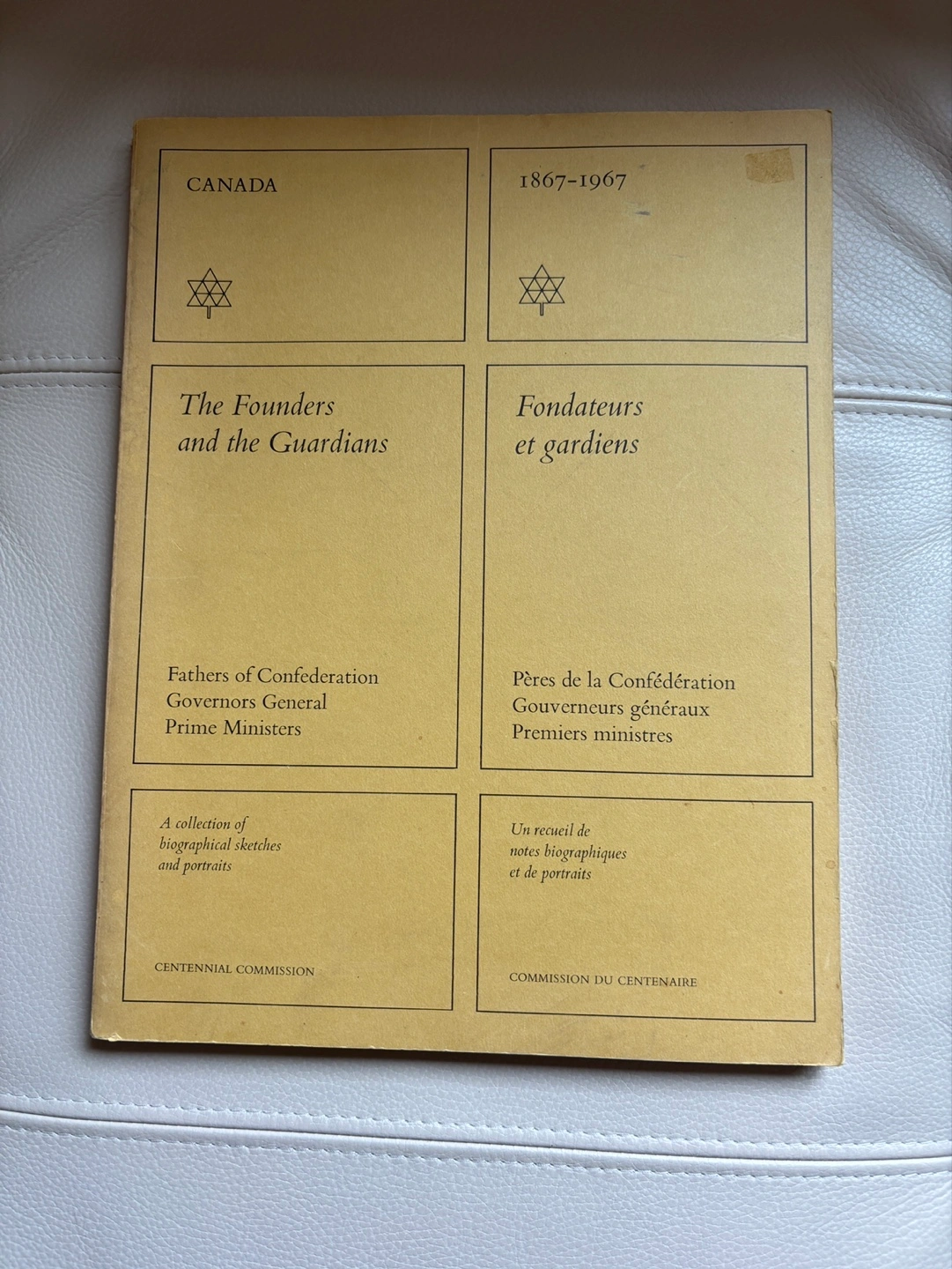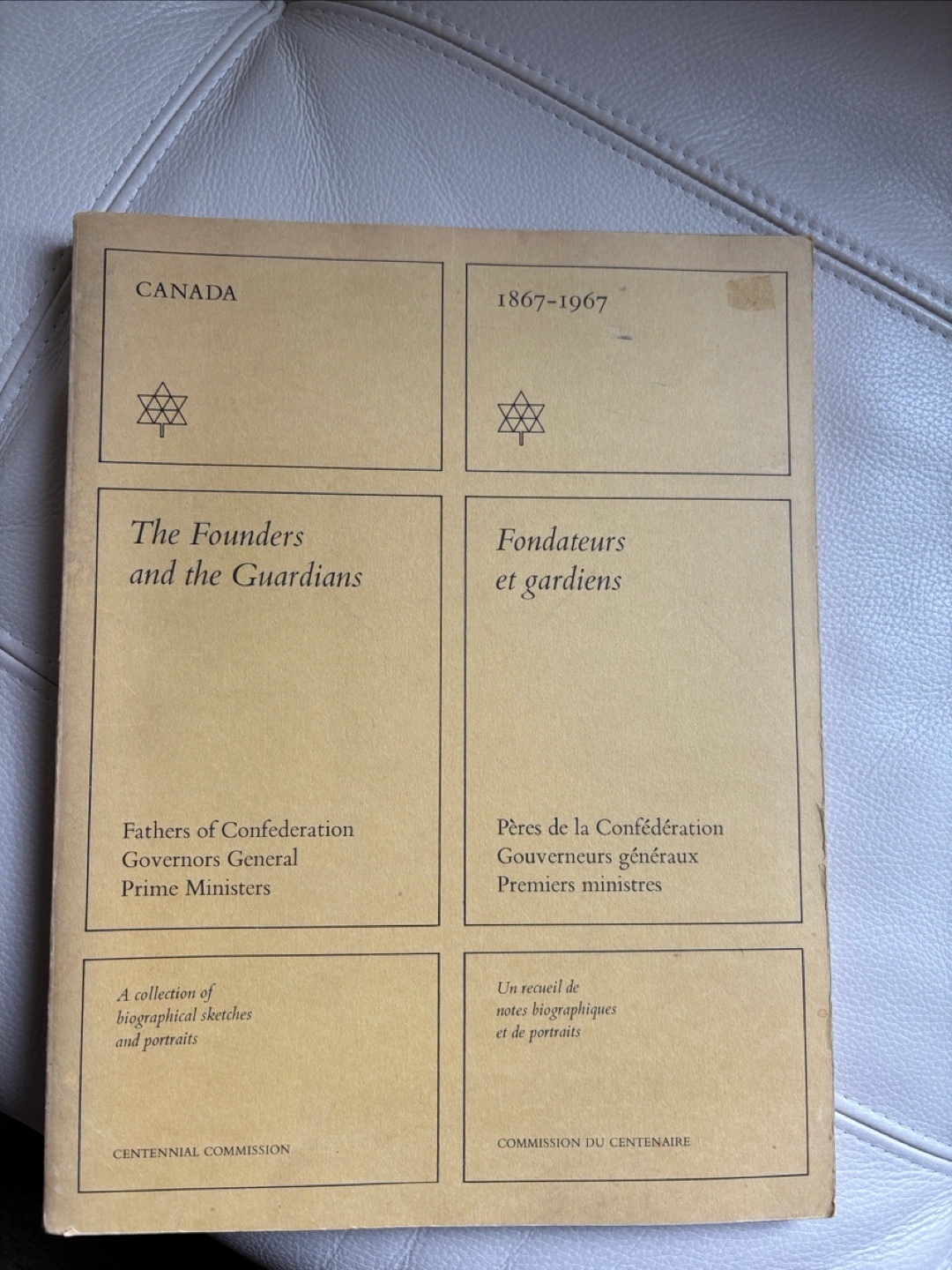 Rare vintage book published by the Centennial Commission. Features biographical sketches and portraits of Fathers of Confederation, Governors General, and Prime Ministers. Bilingual edition in English and French. Excellent collectible item for Canadian history buffs. Some smudges as shown. In very good condition. From a smoke and pet free home. Pickup only in the St Lawrence market area of downtown Toronto. Cash only.