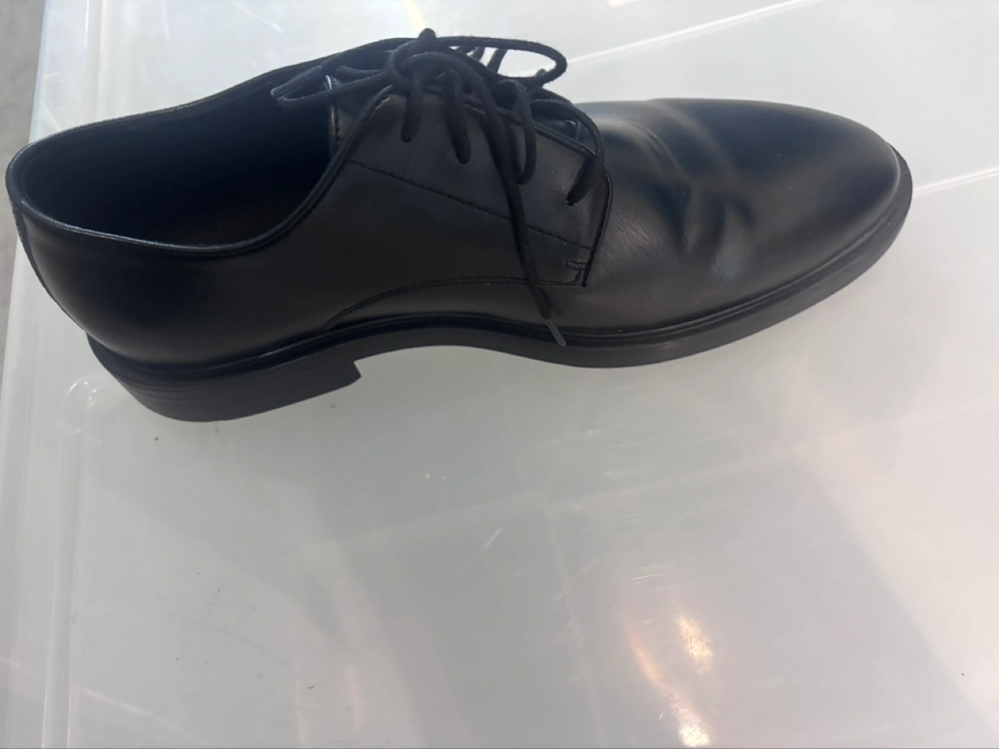 Pair of men's black shoes. Lace-up closure. Simple, classic style. Good for work or formal occasions.
