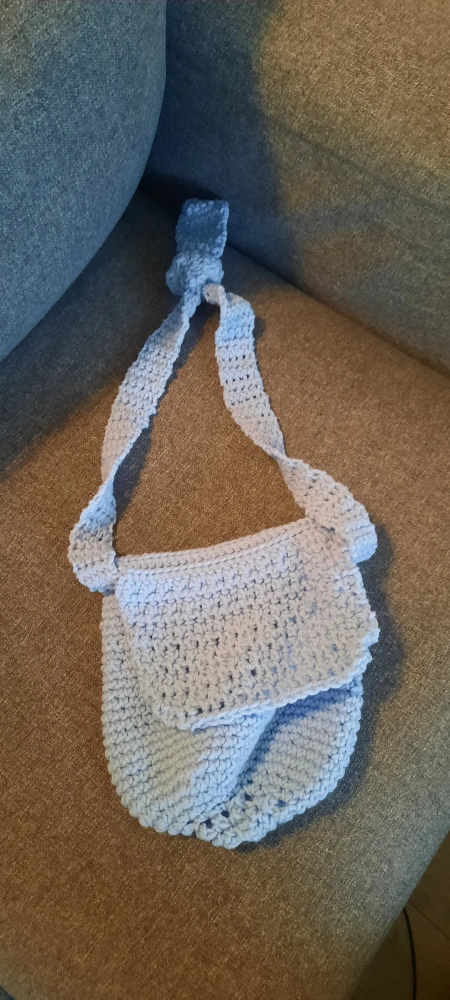 Adorable light blue crocheted shoulder bag. Small size, perfect for essentials. Unique handmade design. Single strap.