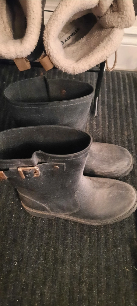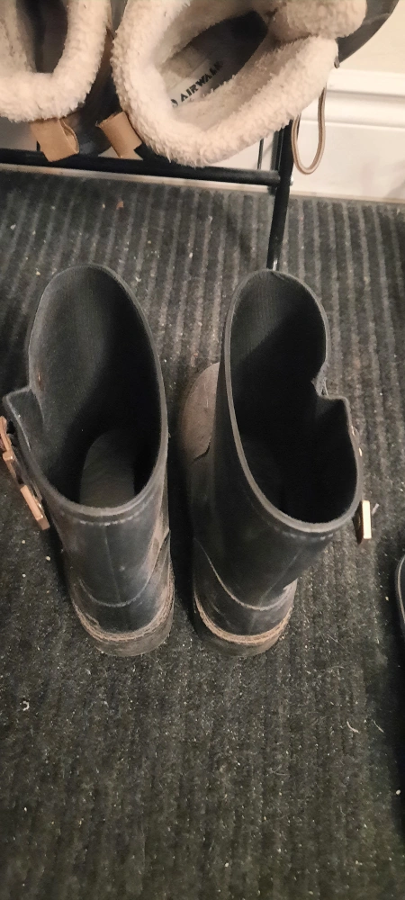 Pair of women's black rubber boots. Buckle detail. Used condition. Some wear and tear.