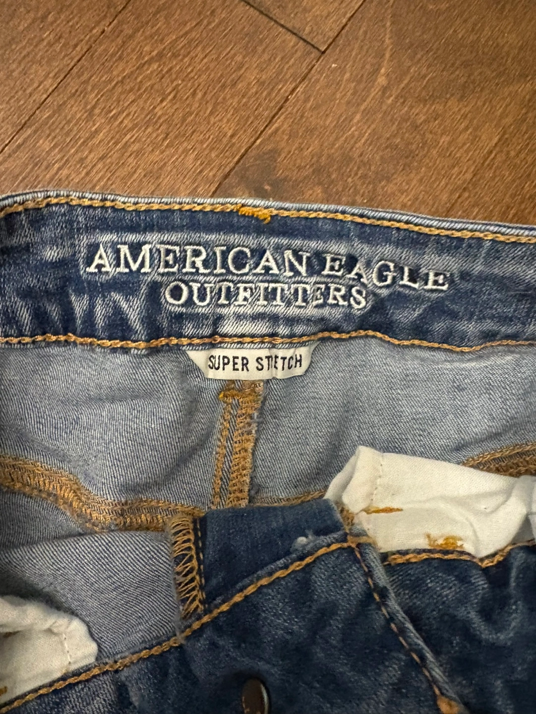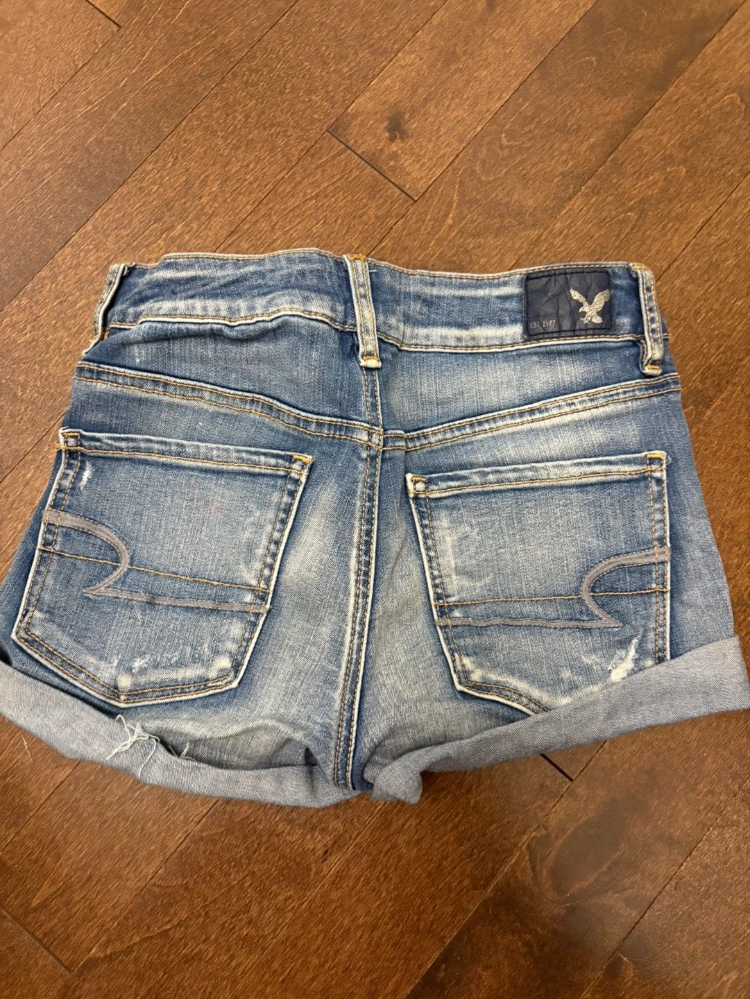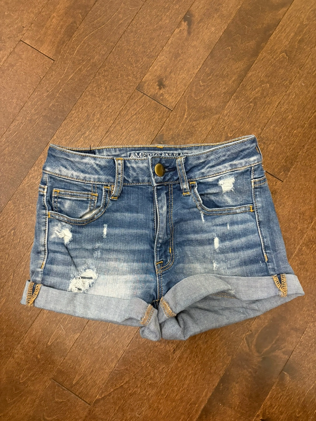 Distressed denim shorts. Rolled cuffs. Light wash. Super stretch material. Excellent condition.