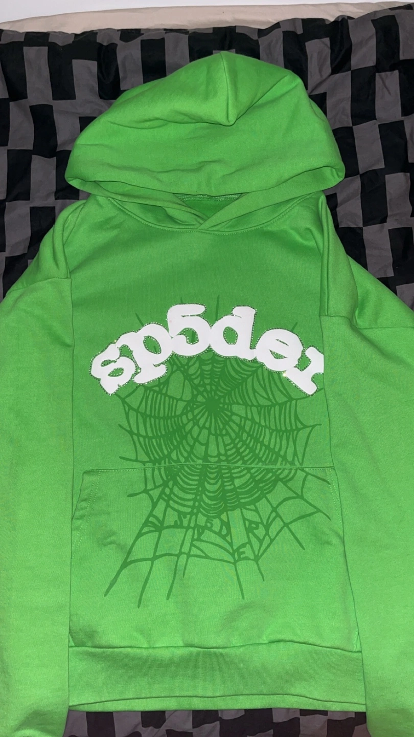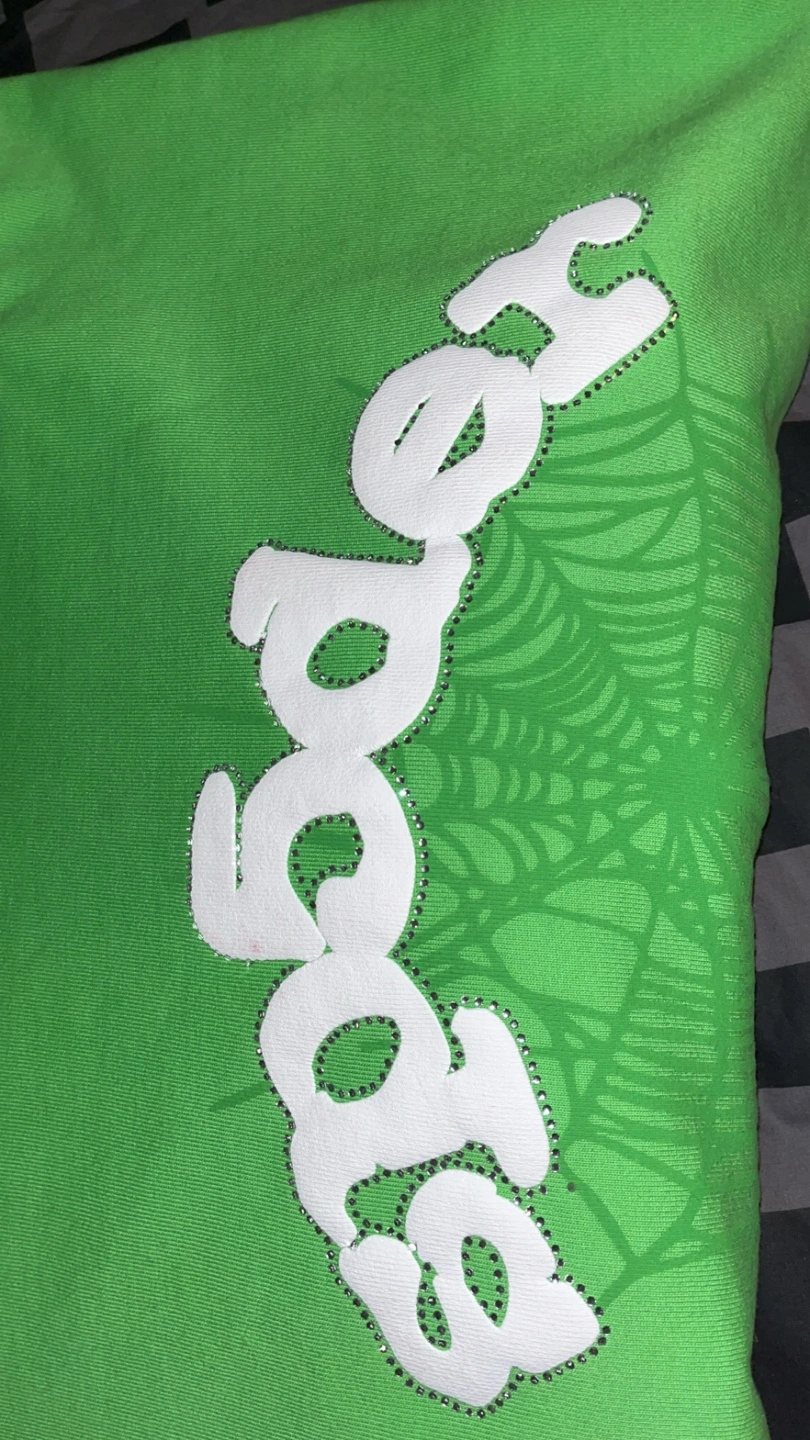 Lime green Sp5der hoodie. Features a spiderweb design and rhinestone detailing. Size large.