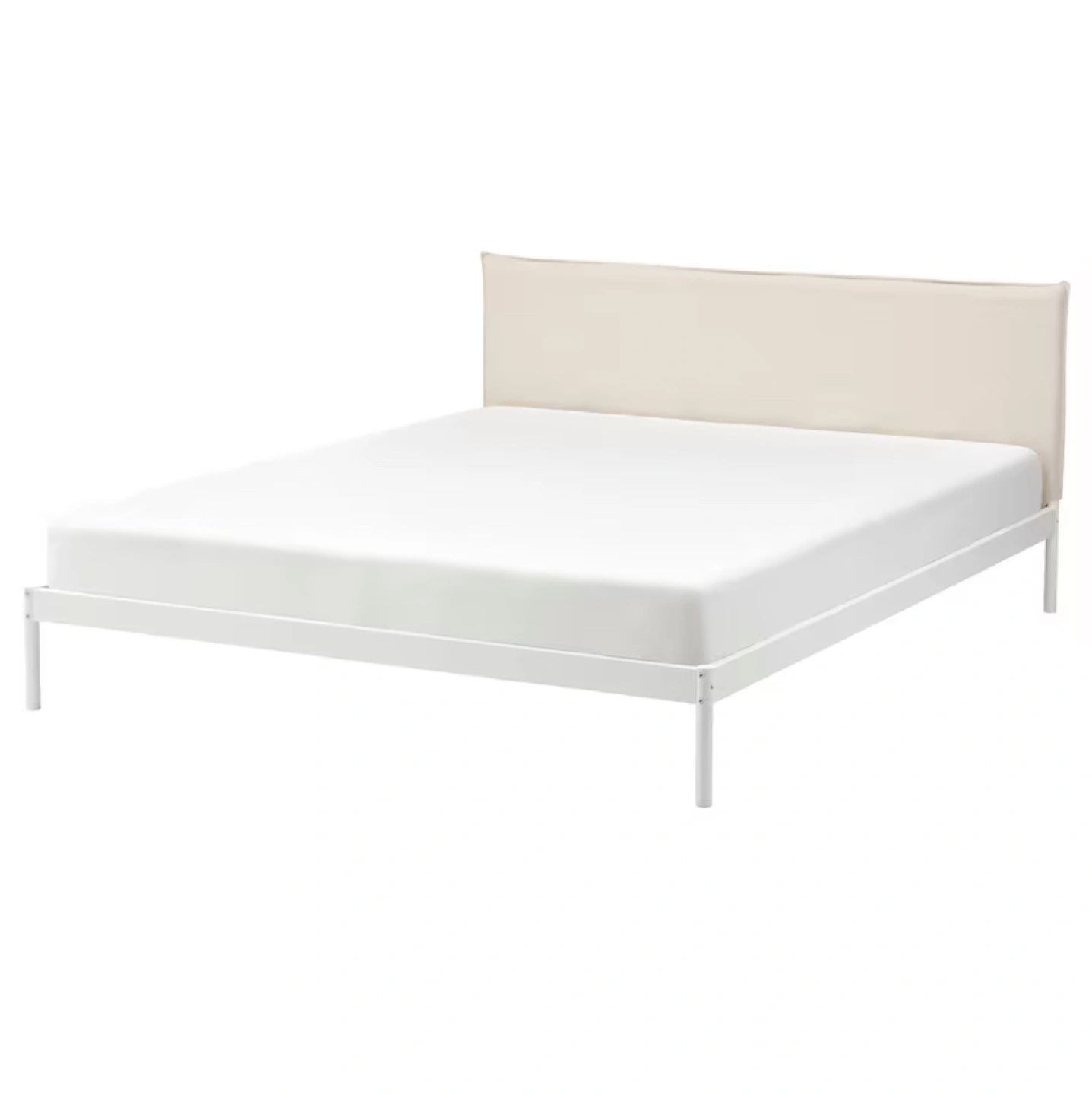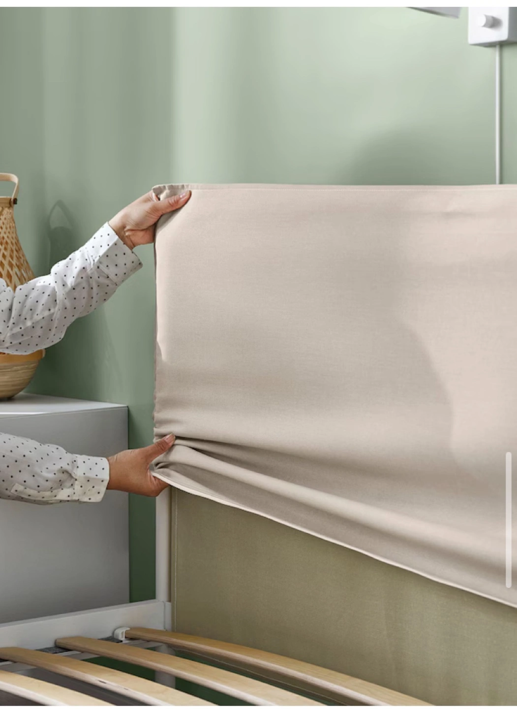 The headboard doesn’t have a cover currently but can be purchased from ikea (please see the pictures). Don't mind purchasing it and adding, but will be extra cost. Rest is in mint condition, dismantled.