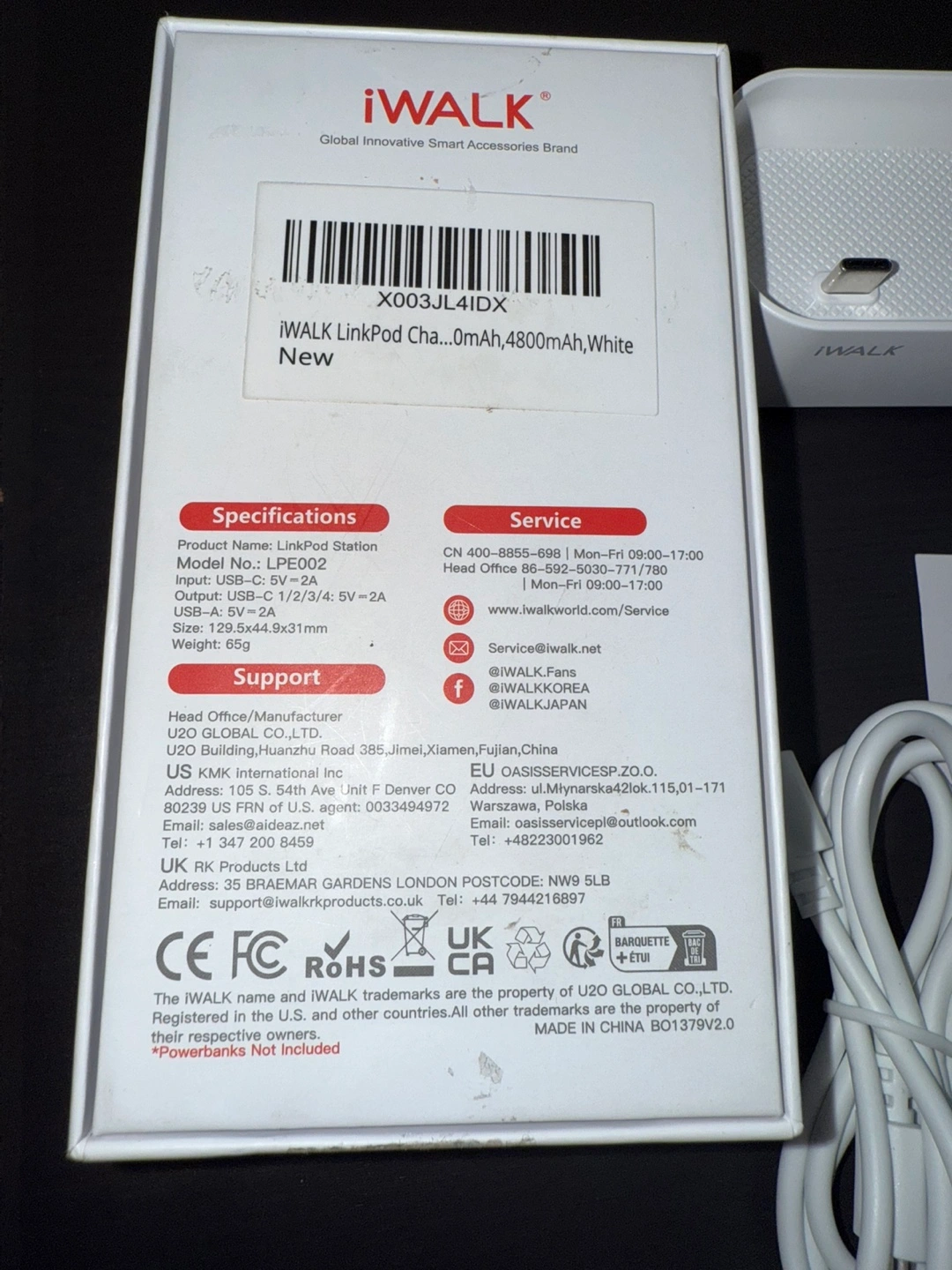 Brand new, iWALK LinkPod Station. White colour. Includes charging cable and instructions. Charges multiple devices simultaneously.