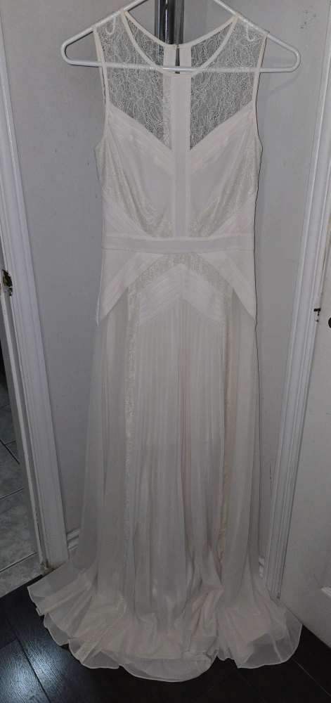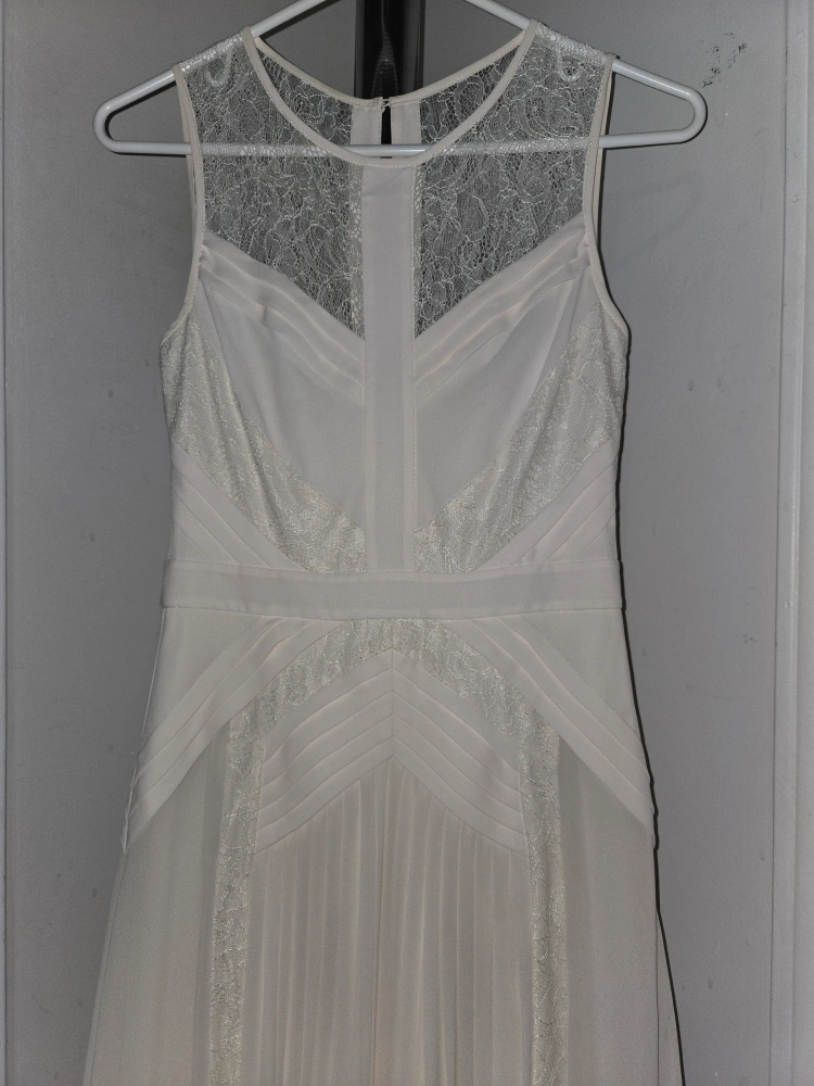 Beautiful off-white maxi dress. Features delicate lace detailing and pleated skirt. Sleeveless design. Elegant and sophisticated.