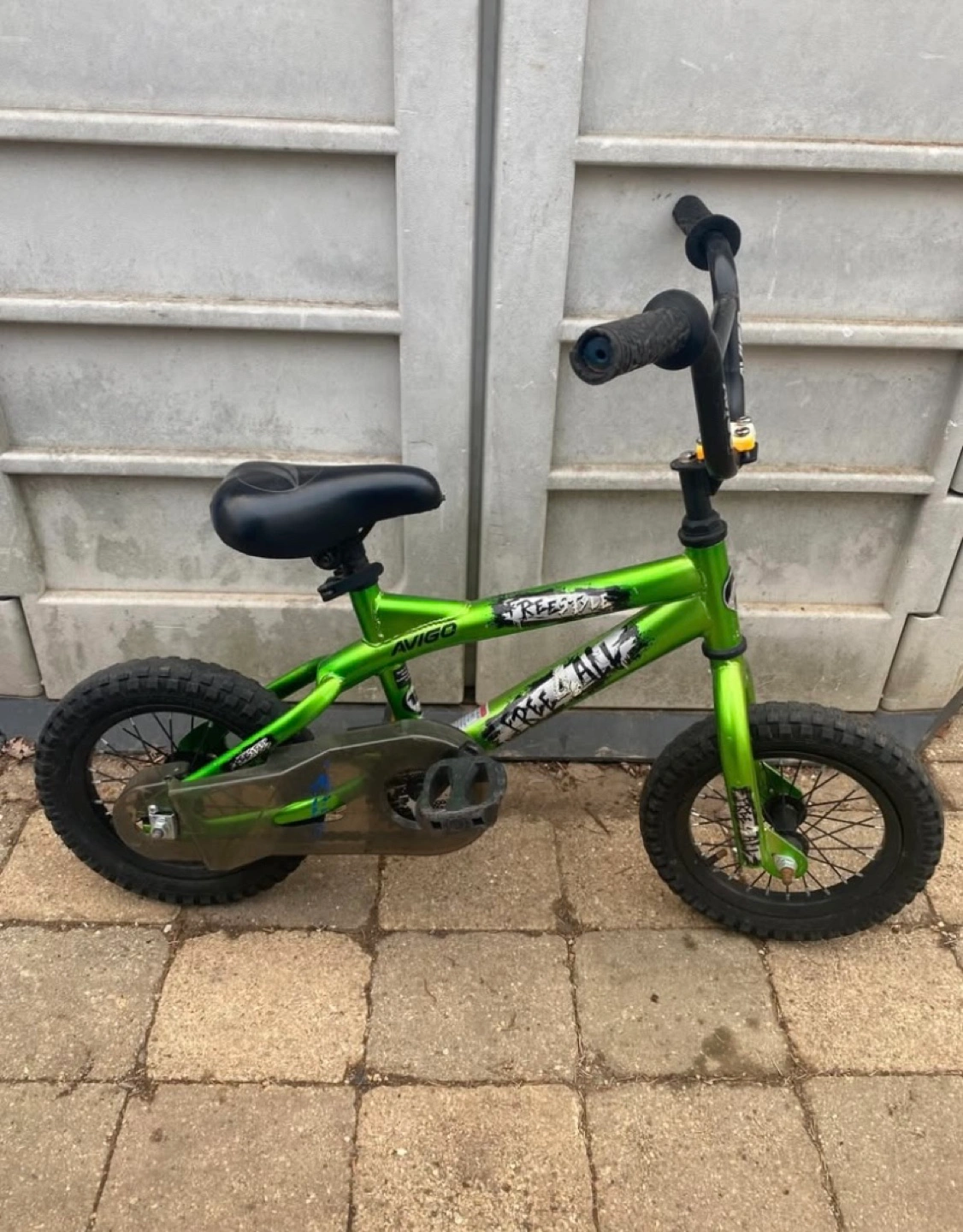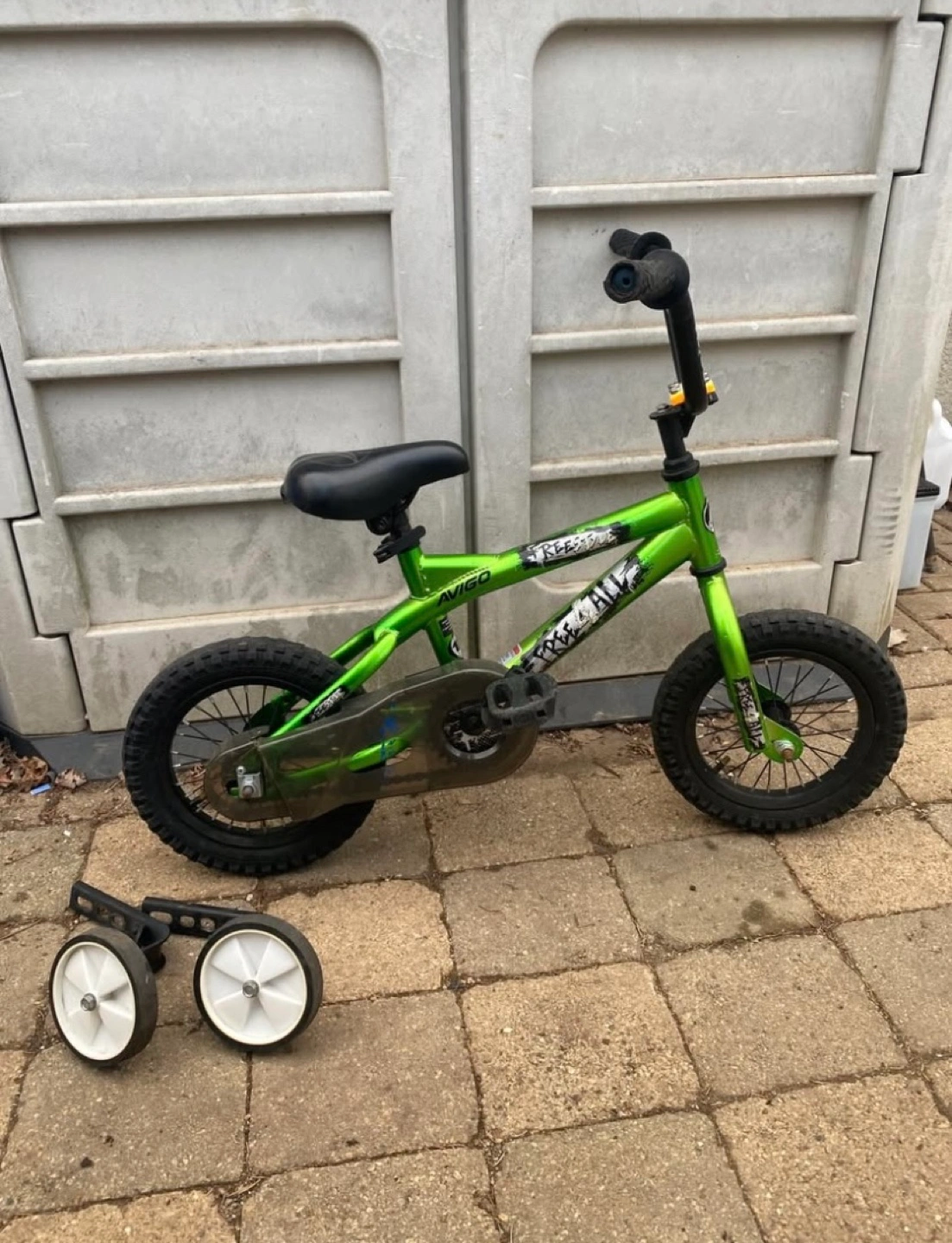Green kids' bike. Includes training wheels. Small size, good for younger children. Some wear and tear.
