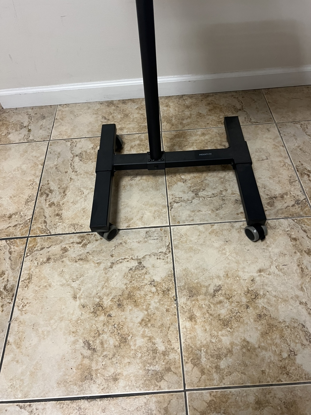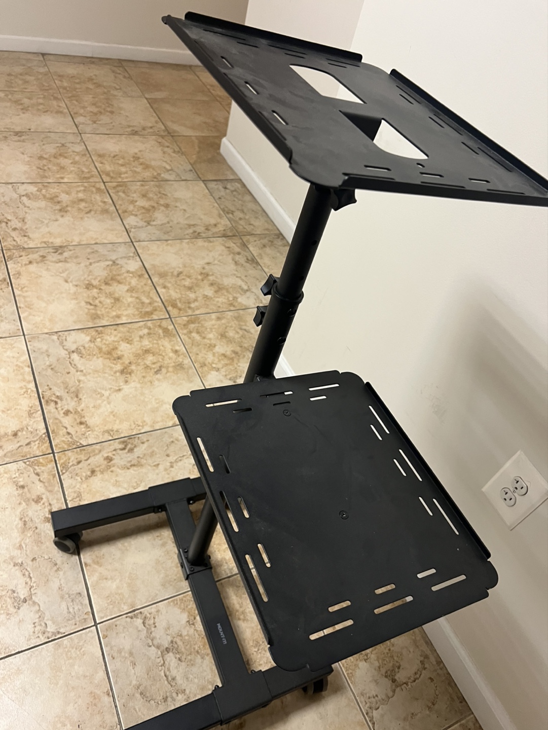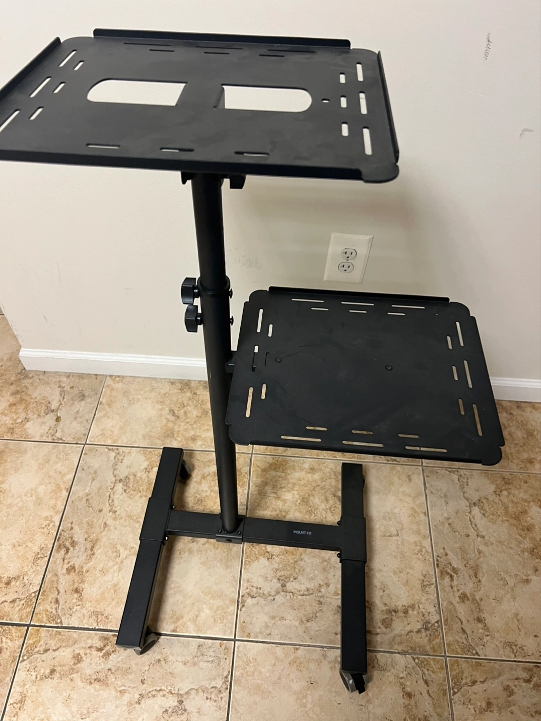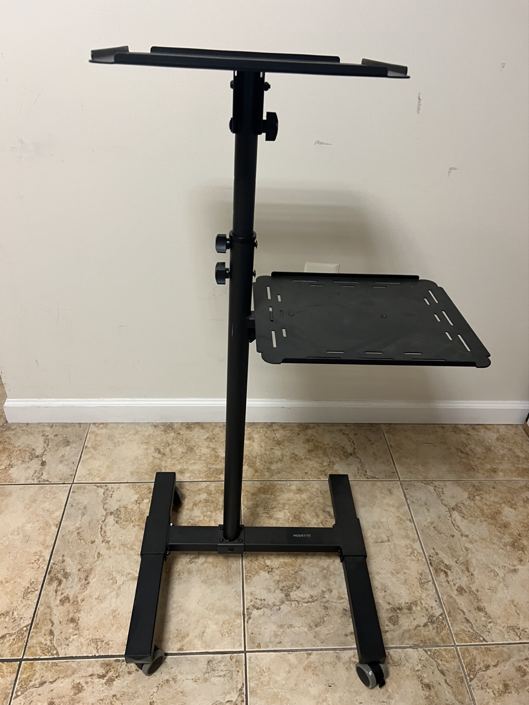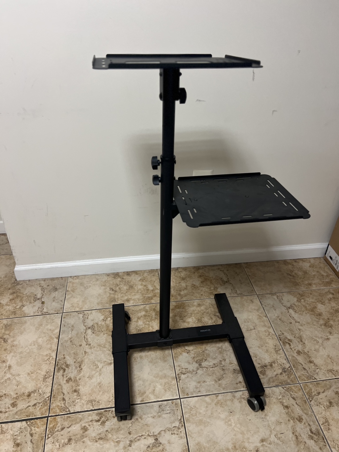 Rolling projector stand. Features two shelves. Height adjustable. Black metal construction. Wheels for easy mobility.