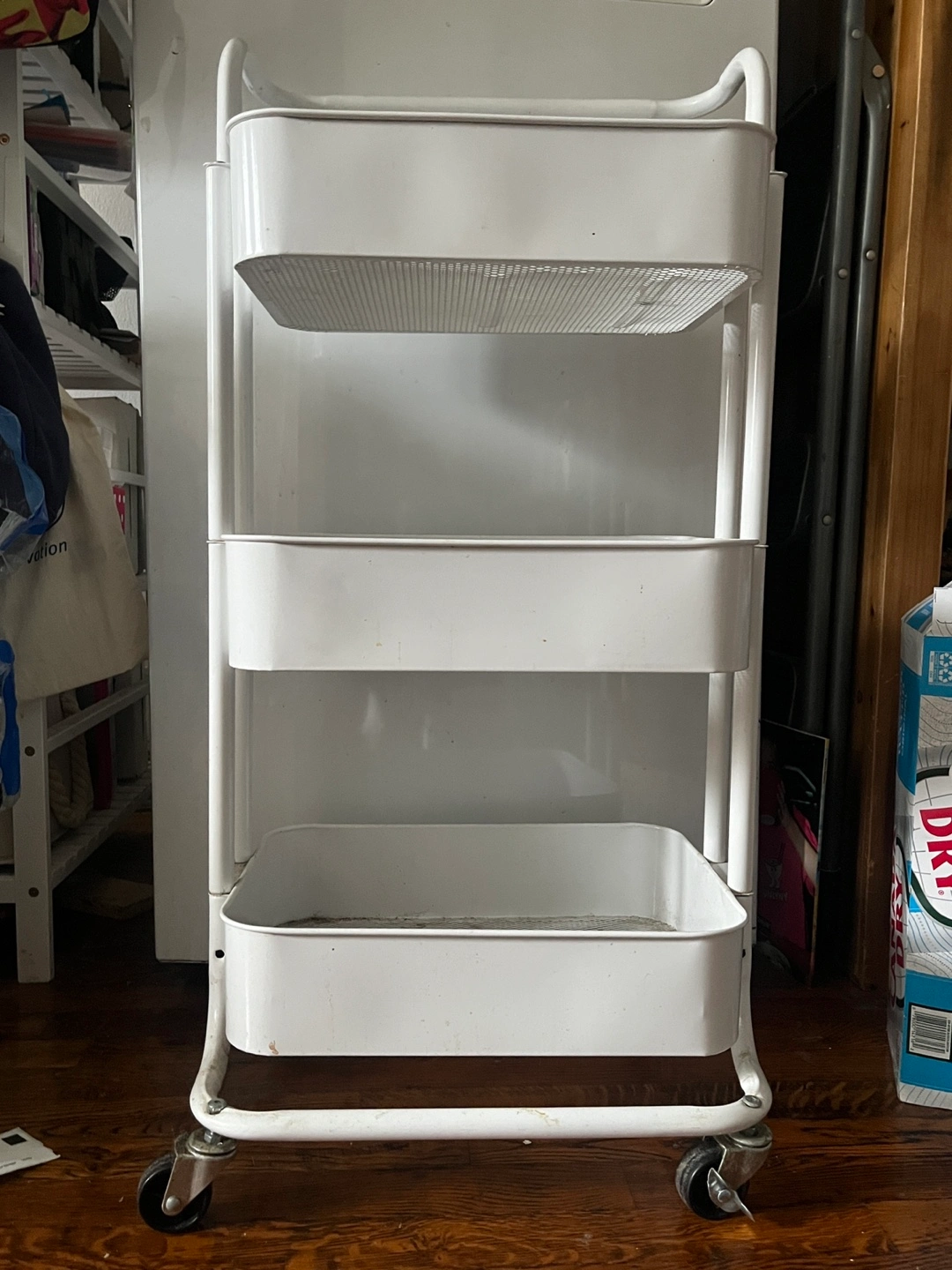 Three-tiered rolling cart. White metal frame. Each shelf is a rectangular bin. Small wheels for easy mobility. Some minor wear.