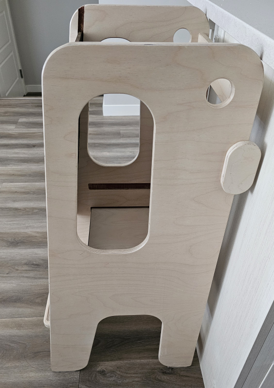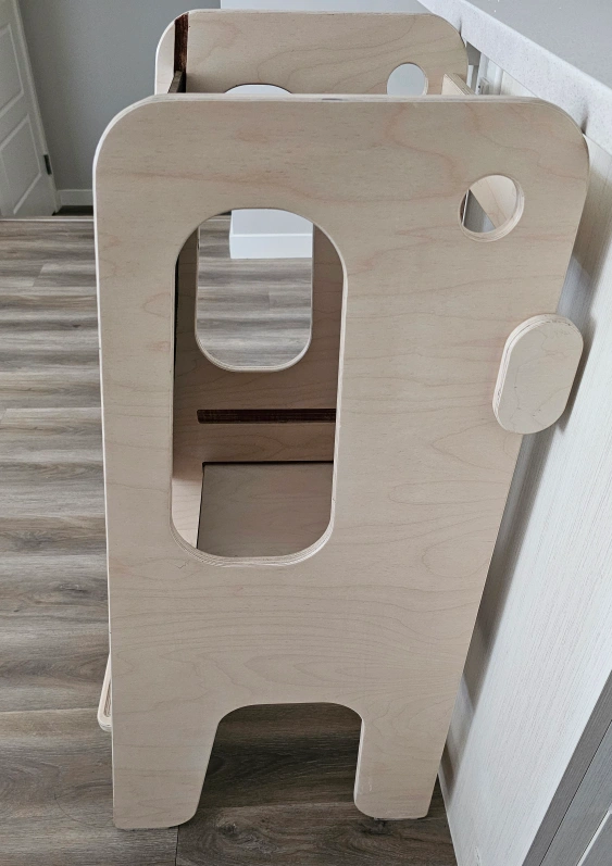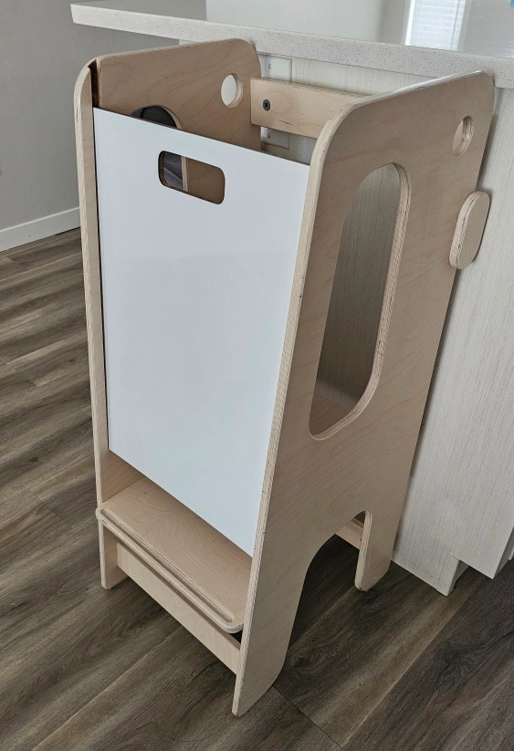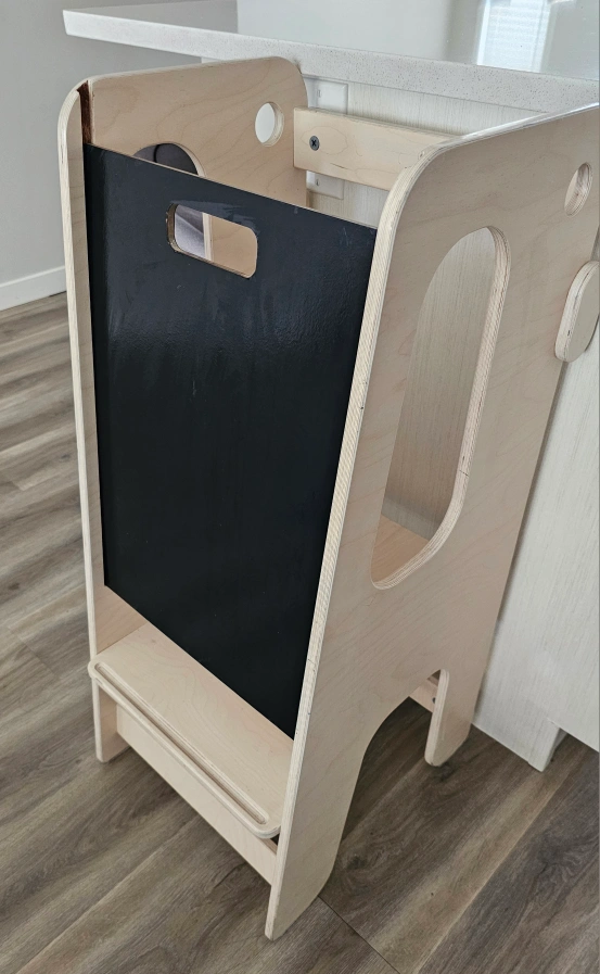 Wooden learning tower, perfect for toddlers. Features a chalkboard panel and sturdy construction. Easy to clean and assemble. Great for helping little ones reach counters.