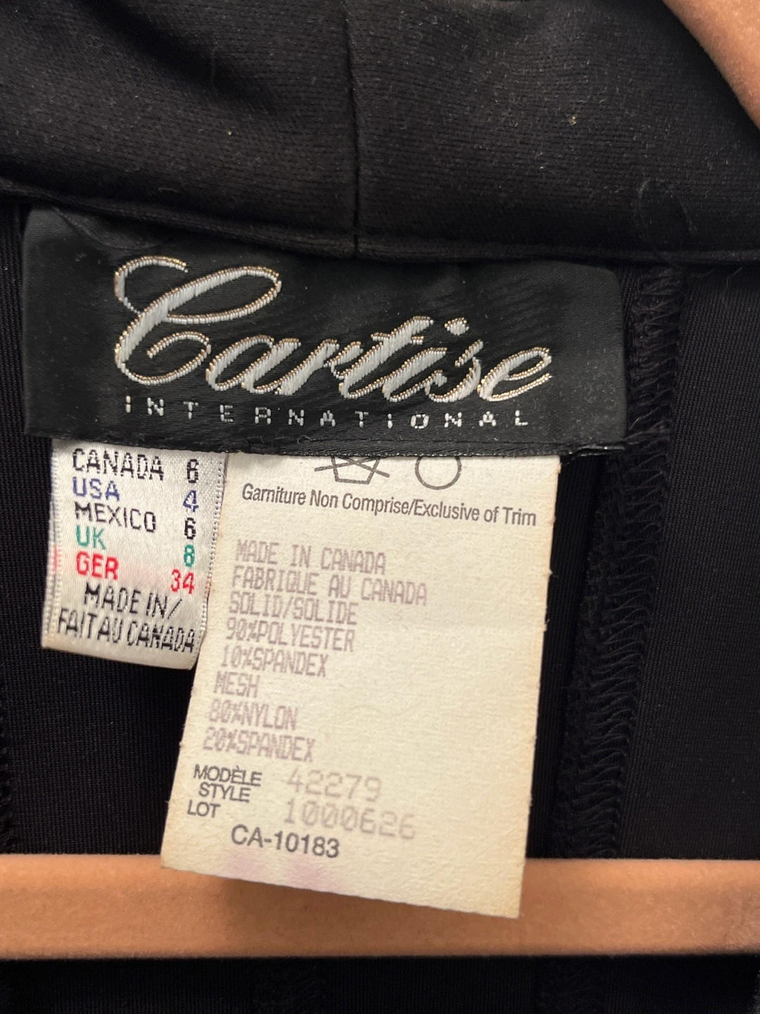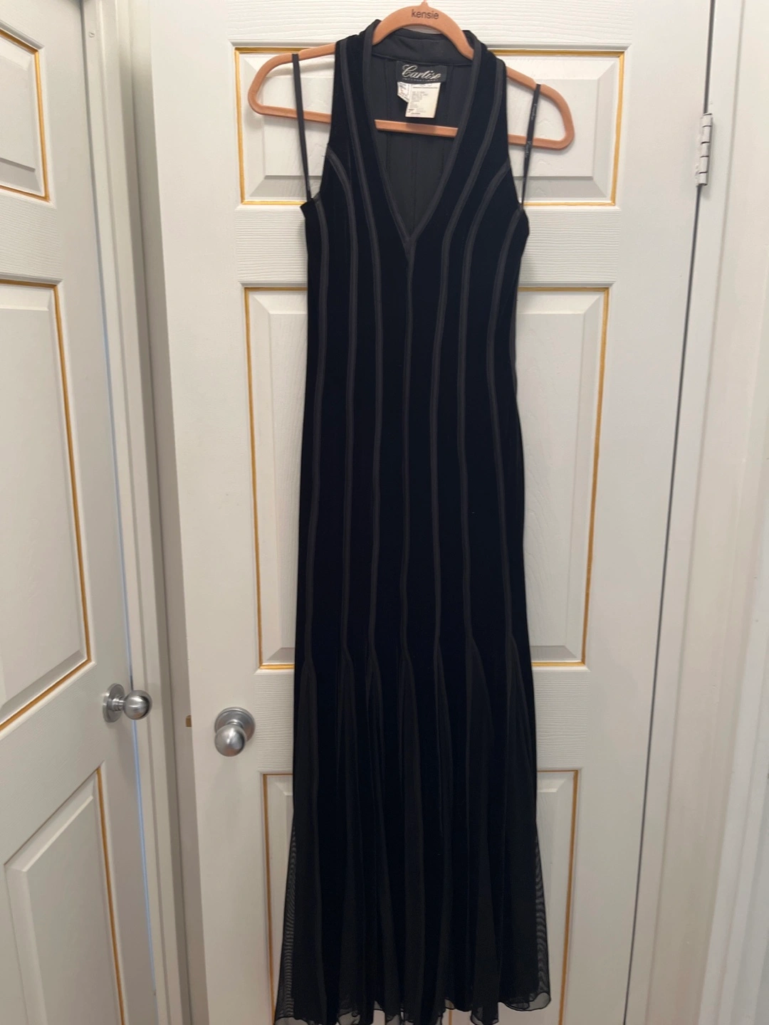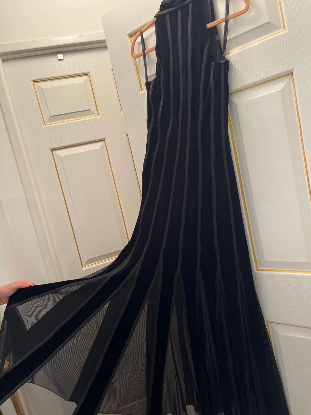 Stunning black velvet maxi dress. Halter neck, floor length. Features vertical velvet panels and sheer mesh sections. Made in Canada. Size 6.