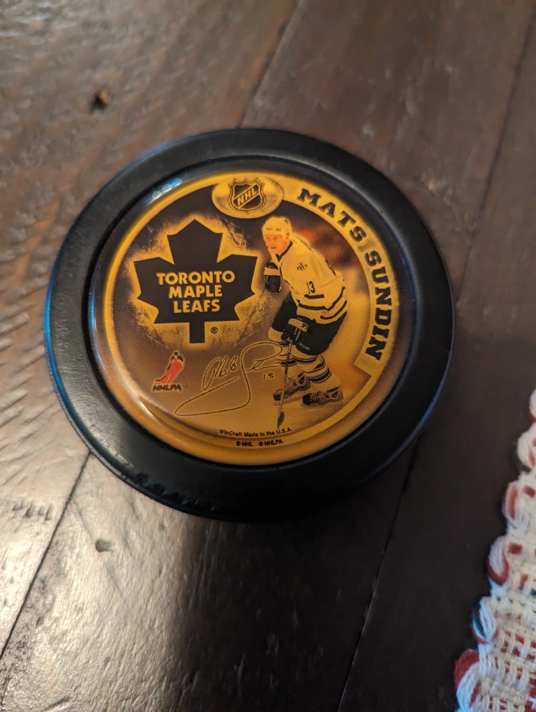 rare NHL license mats sundin Toronto Maple Leafs photo signed puck a rare NHL hockey puck a nice collectible vintage hockey puck.