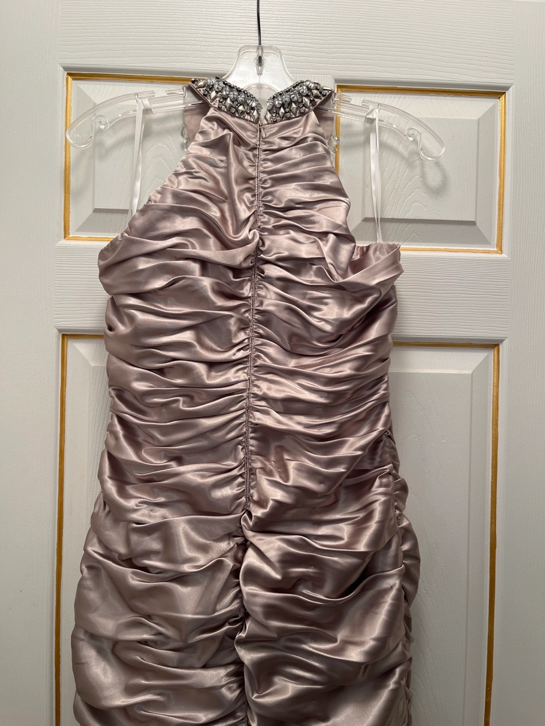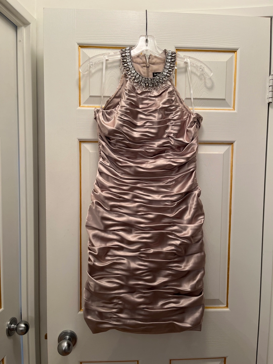 Stunning champagne-coloured mini dress. Features a halter neck and beautiful rhinestone detailing. Ruched bodice. Back zipper closure. Size 8.