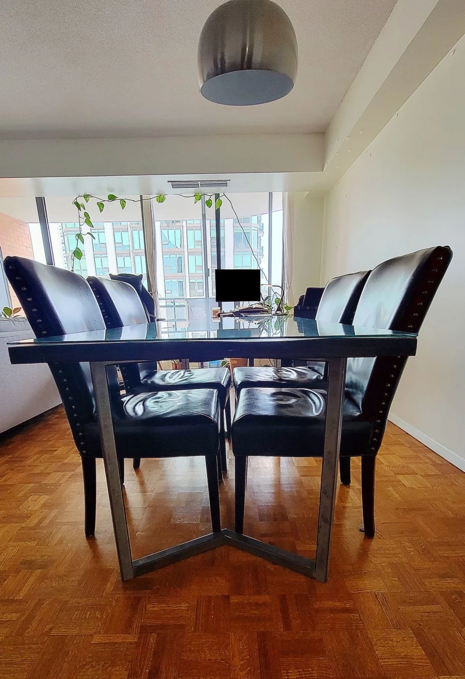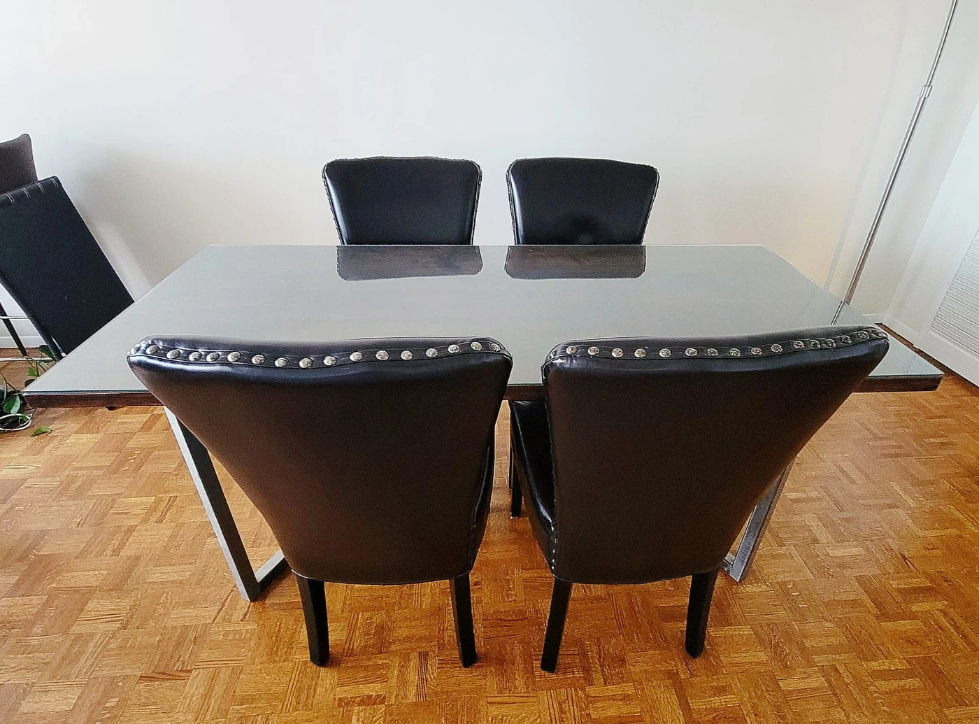 Dark toned solid wood table with clear, glass top. comes with 4 chairs for $175OBO. Table or Chairs could be sold separately.