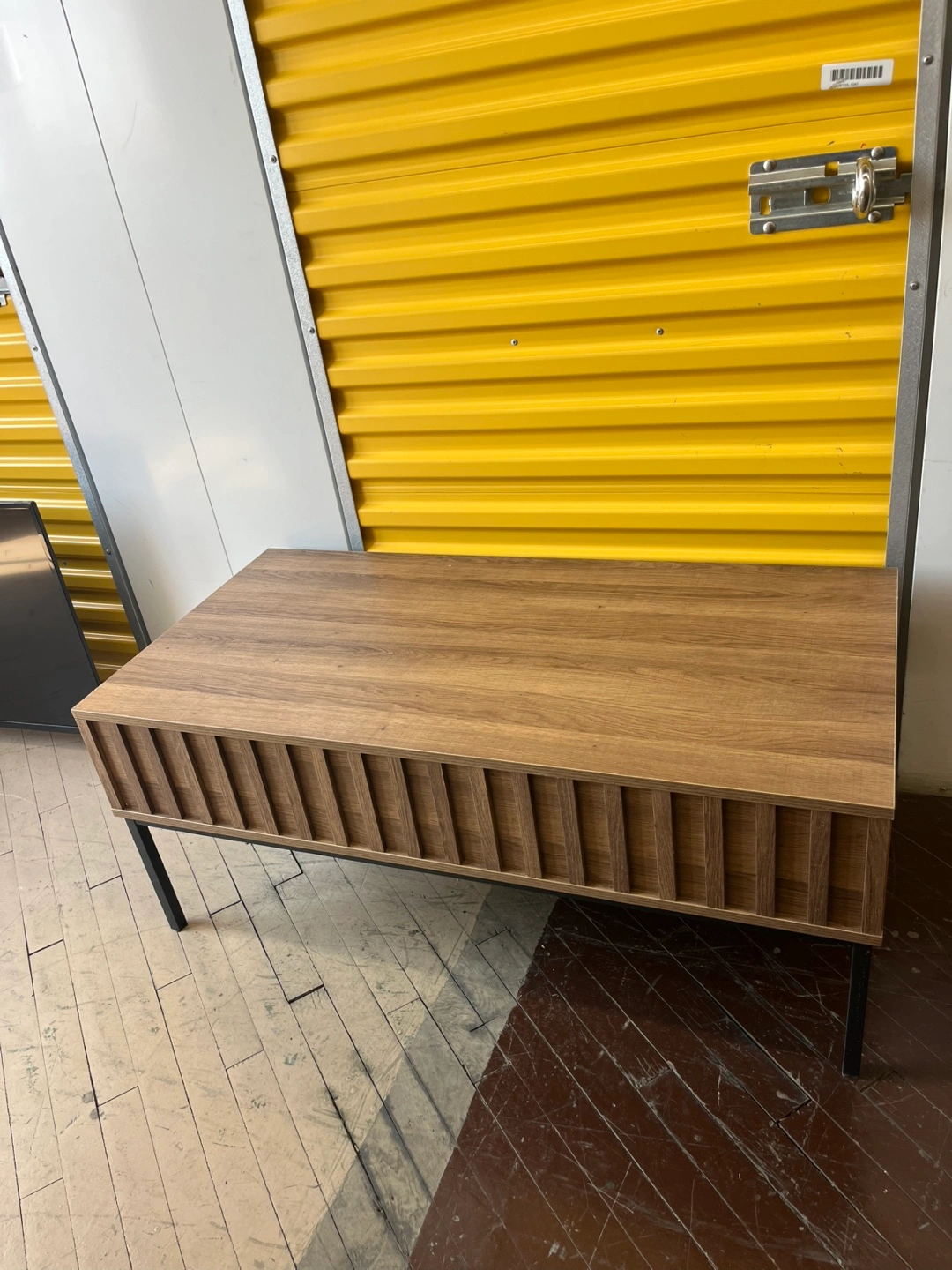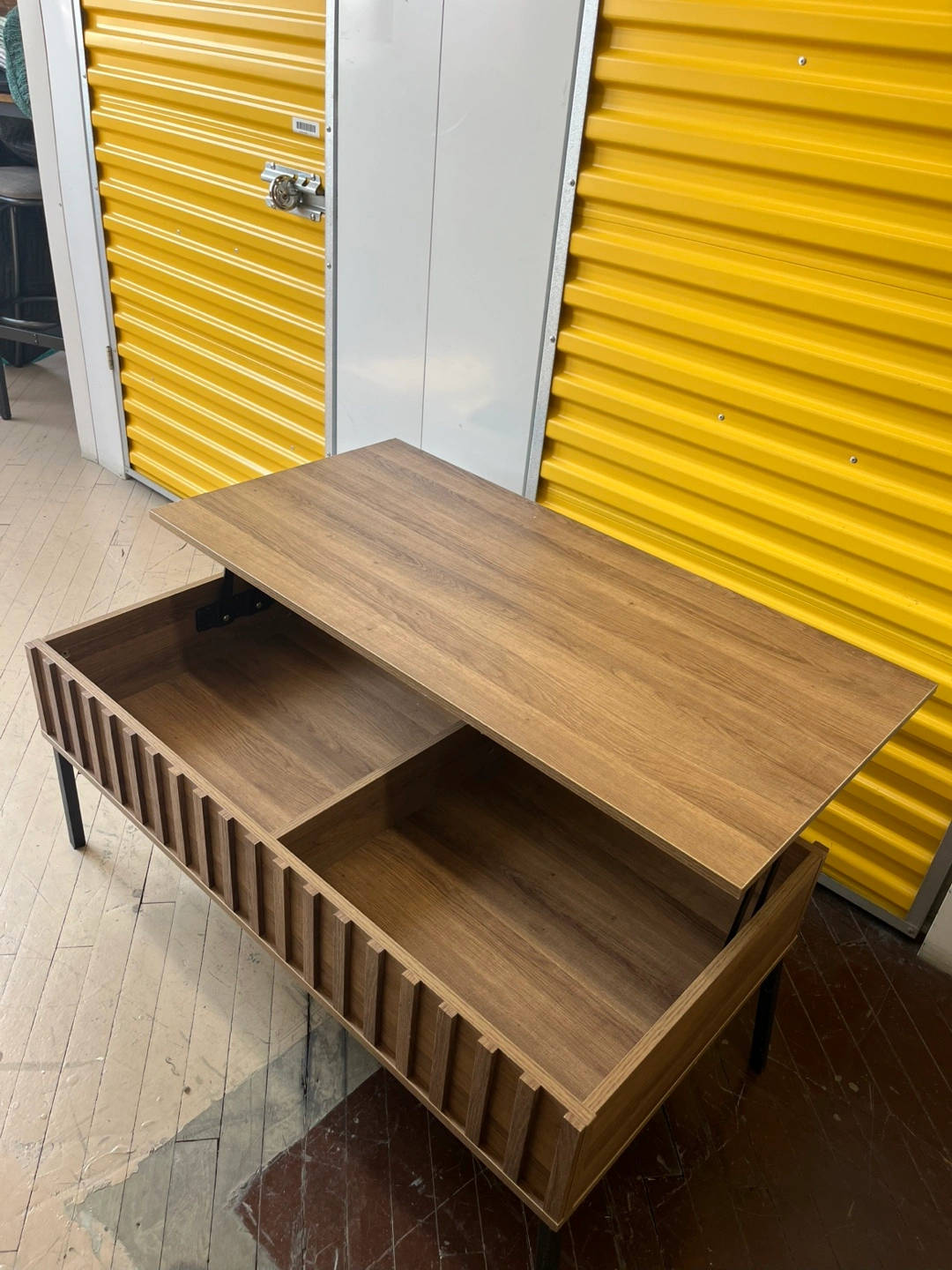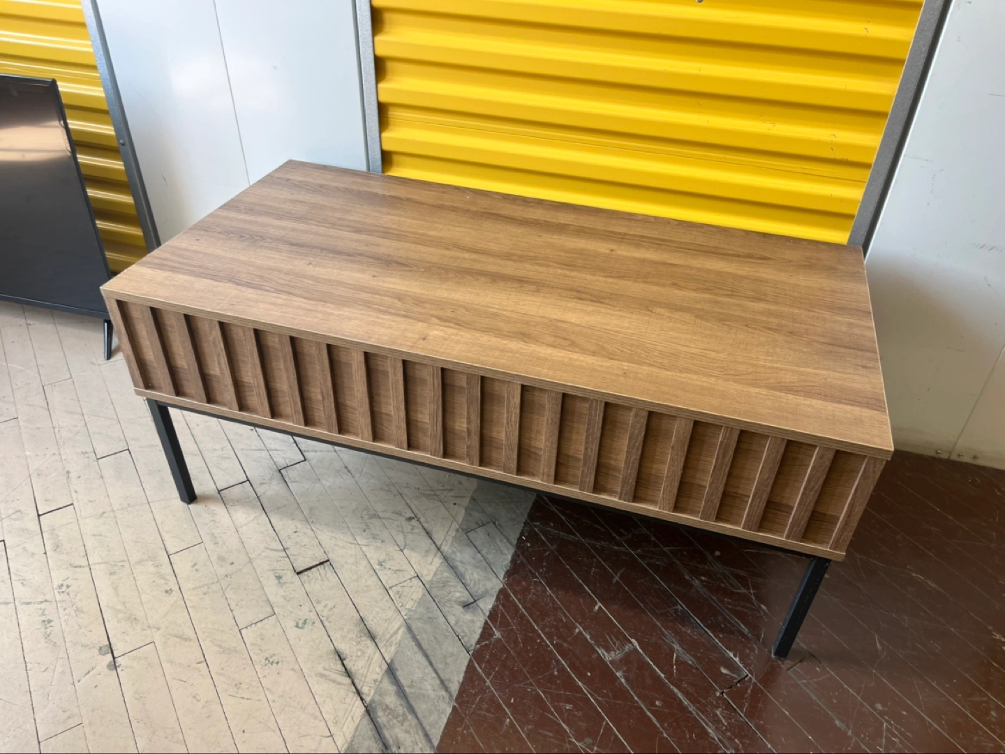 Modern Lift Top Coffee Table with 2 Hidden Storage Compartments. Wood with black metal legs. Pick-up only.