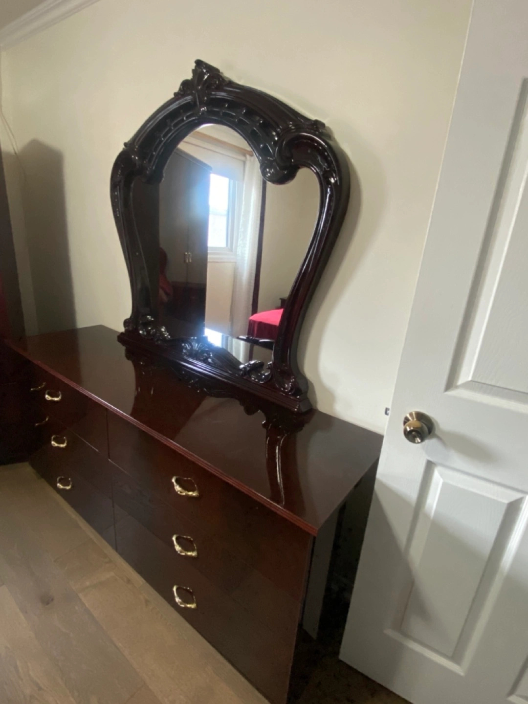 Elegant mahogany vanity set. Features a large mirror and six spacious drawers. Ornate detailing. Great for bedroom.