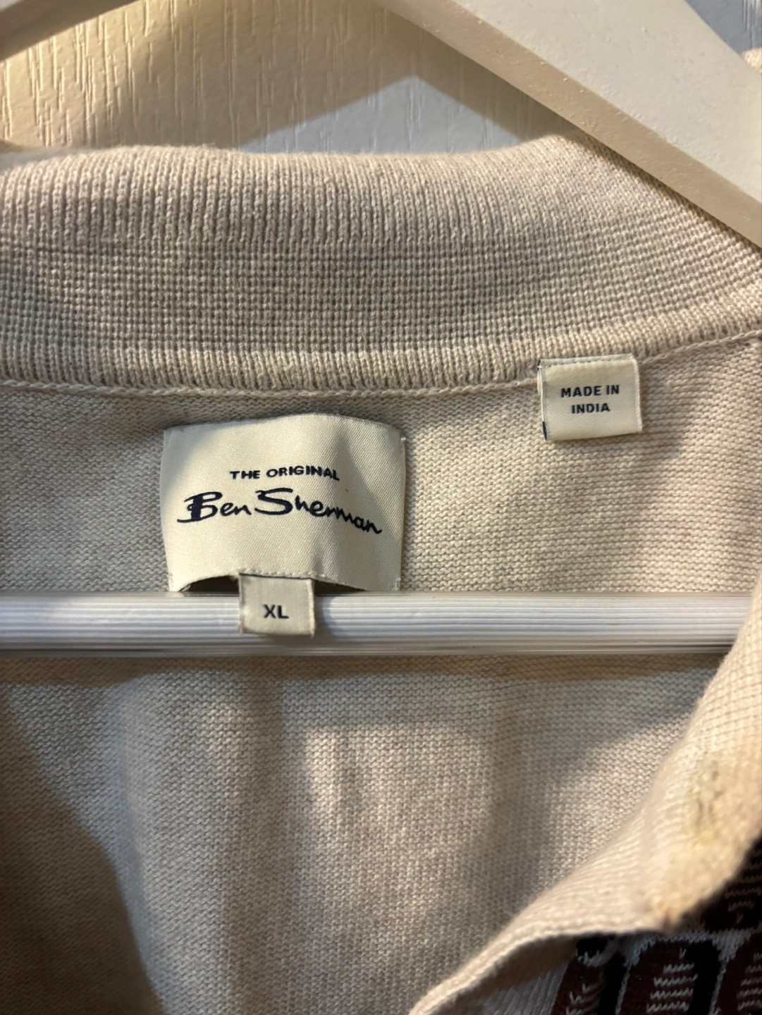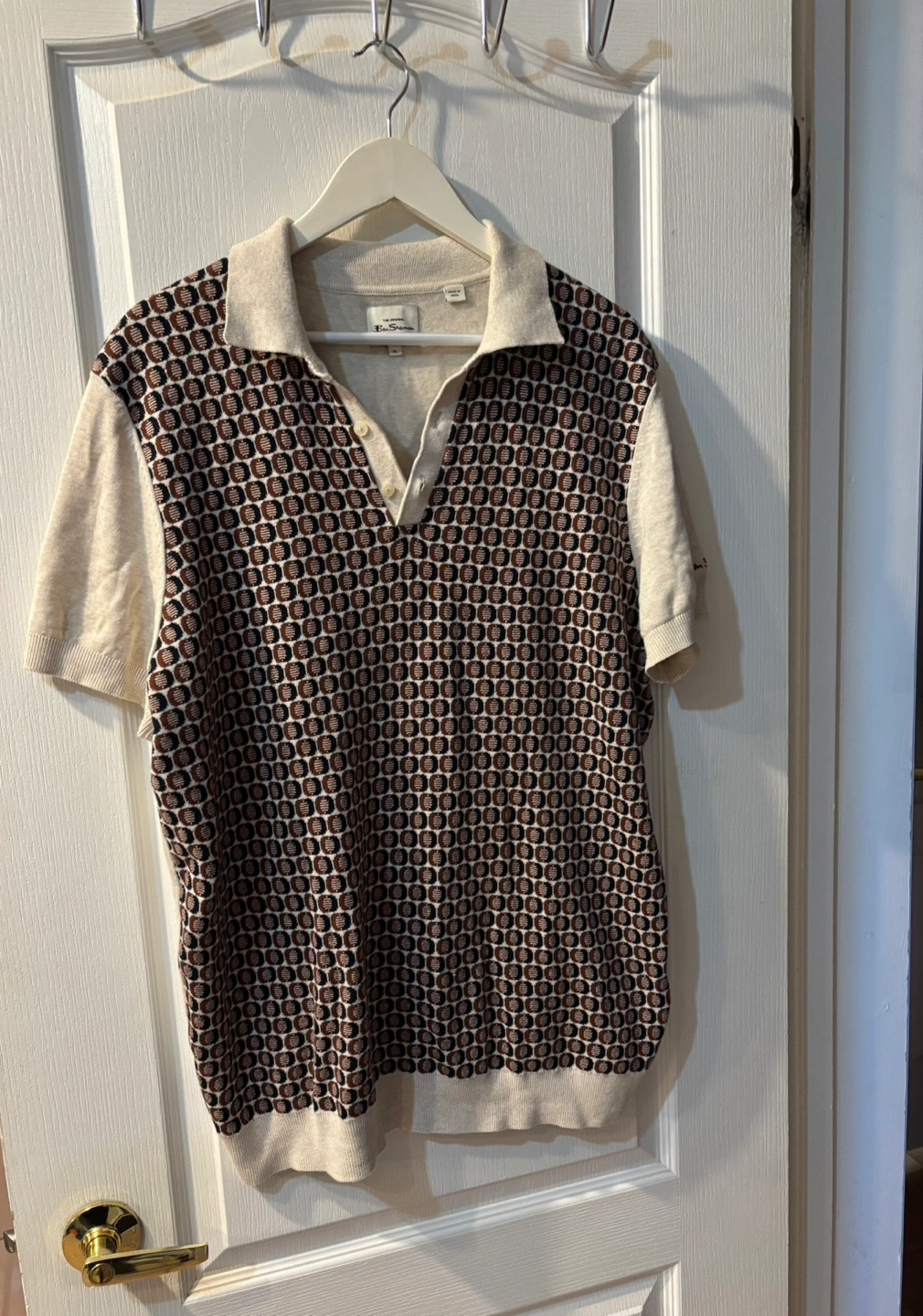 Men's Ben Sherman polo shirt. Size XL. Beige and brown geometric pattern. Short sleeves. Knitted cotton. Made in India. CASH ONLY