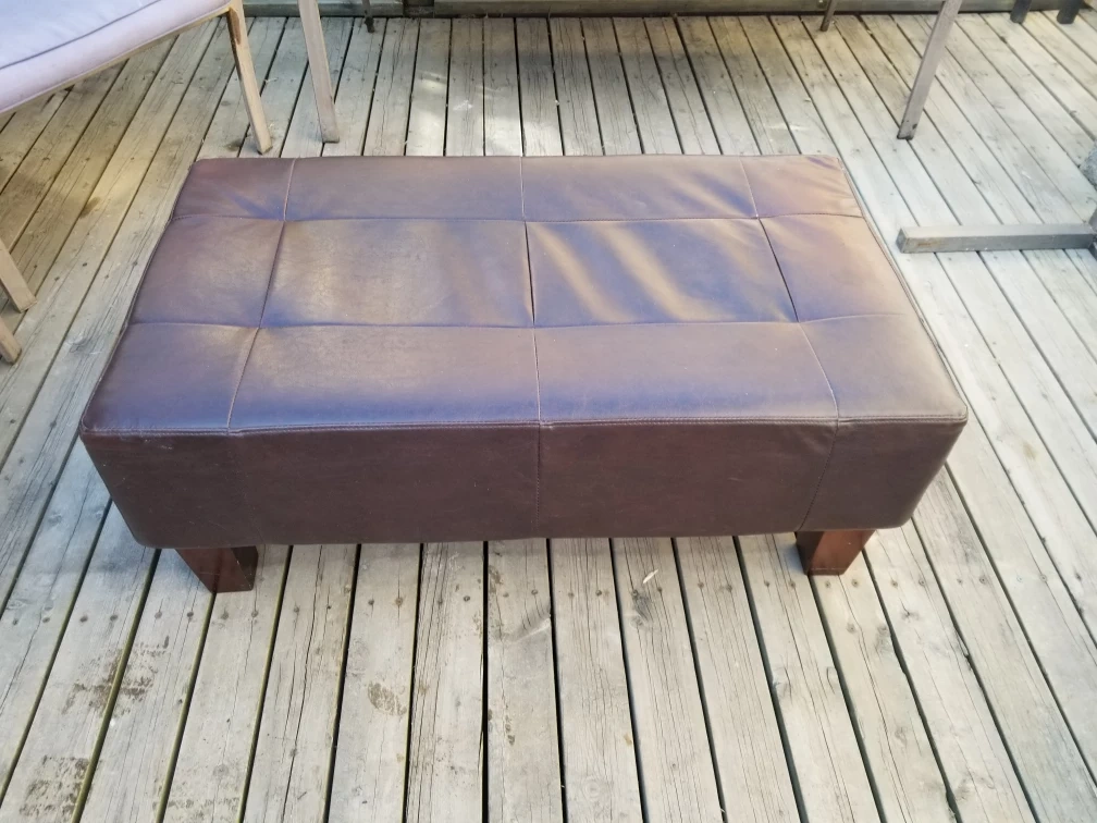Dark brown leather ottoman. Rectangular shape. Four short wooden legs. Shows some wear. Make me an offer. I want it gone asap!
