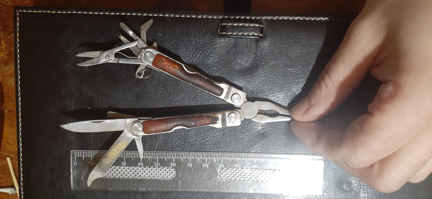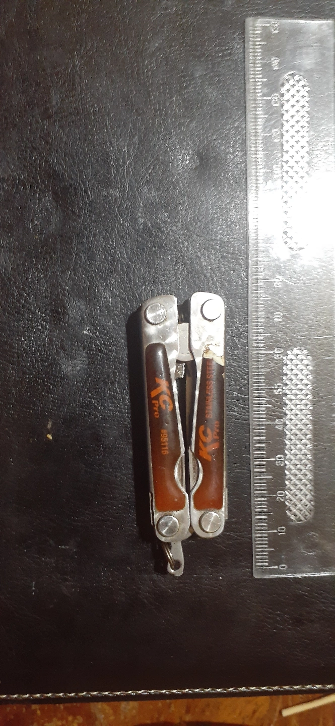 Vintage KC Pro multi-tool. Features pliers, scissors, knives, and a file. Compact size, ideal for keychain.