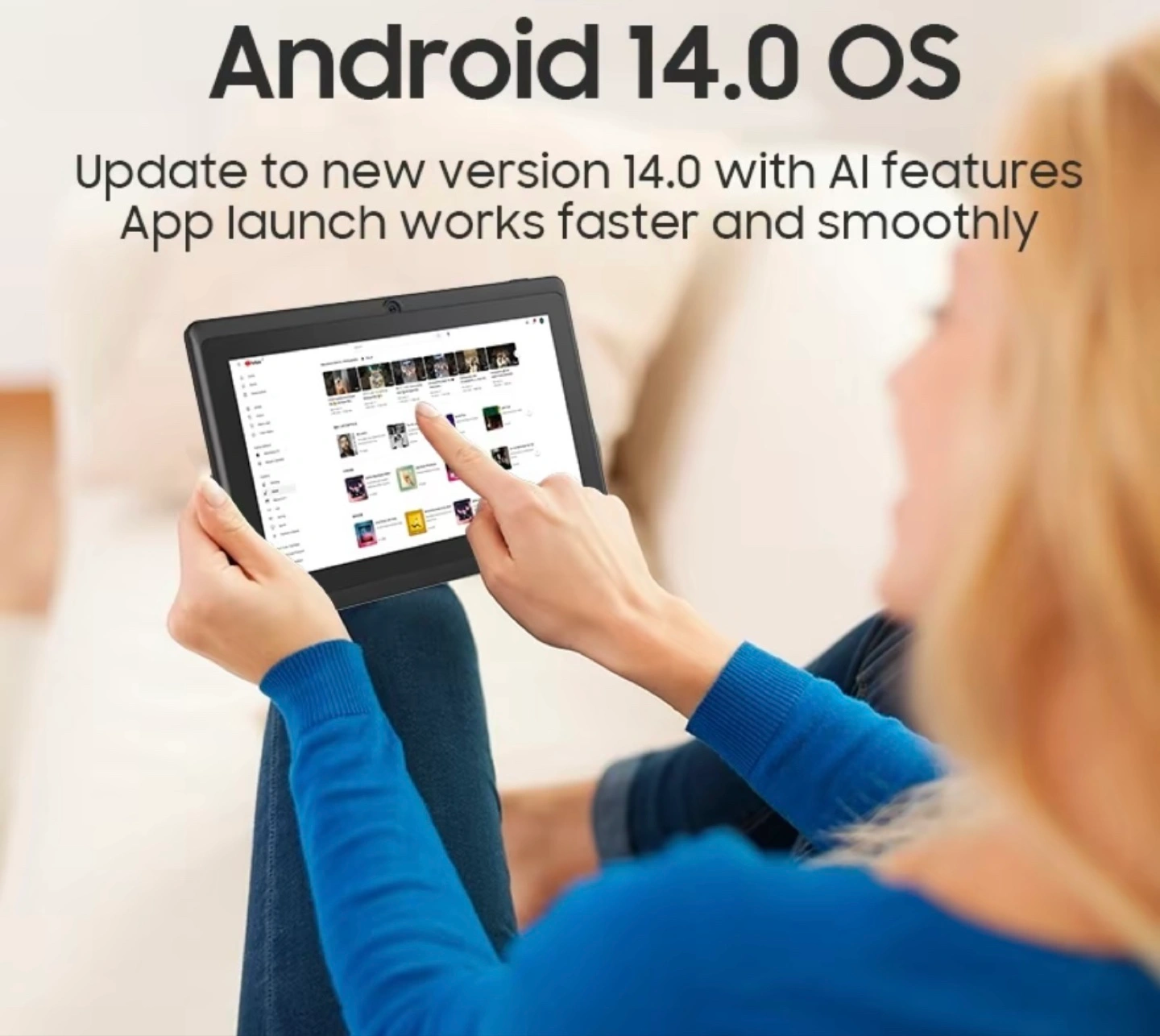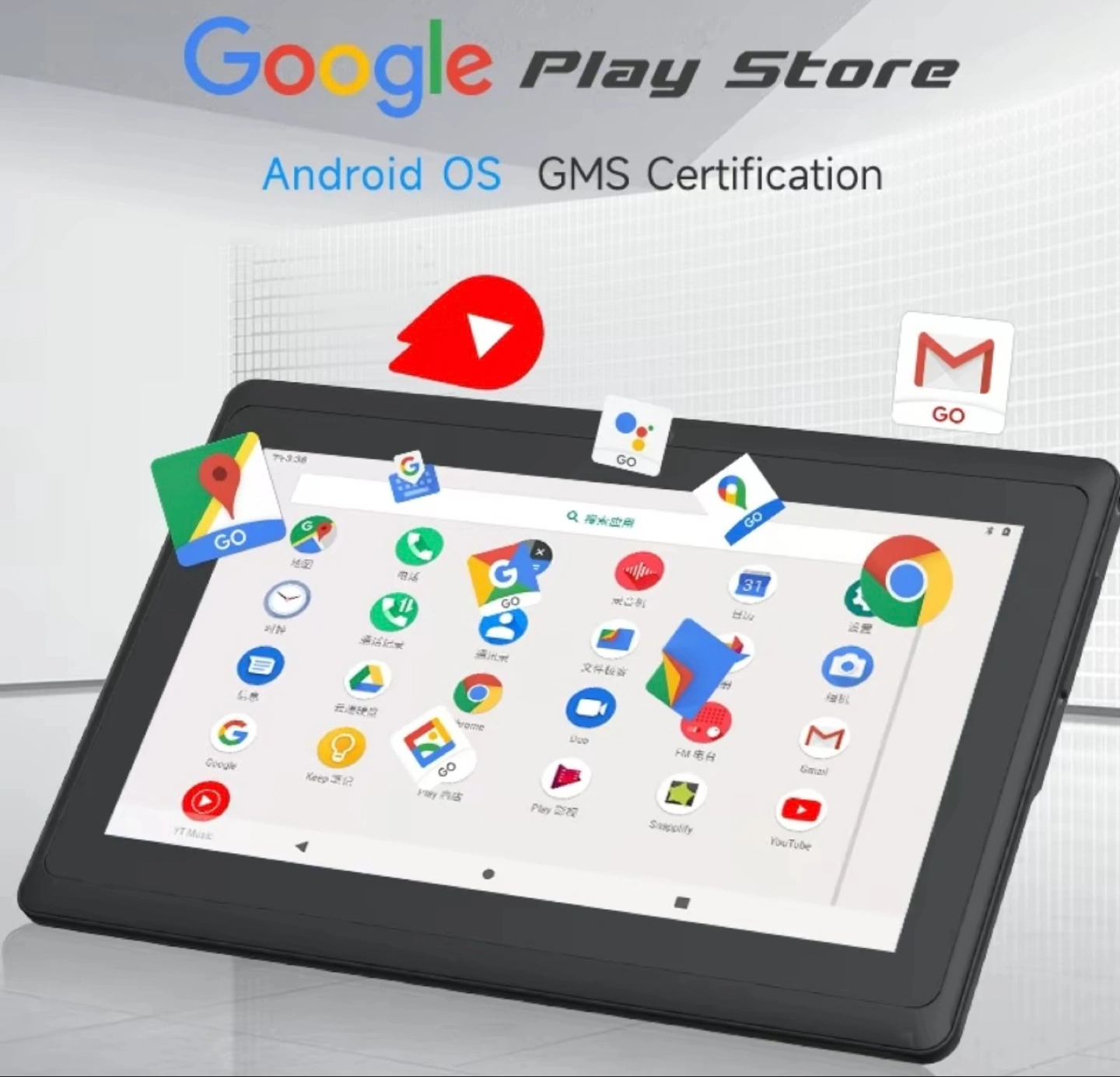 7 inch IPS touchscreen display. Android 14.0 OS. 4GB RAM and 32GB of storage. Google Play Store access. Compact and portable.